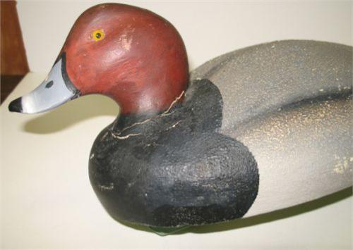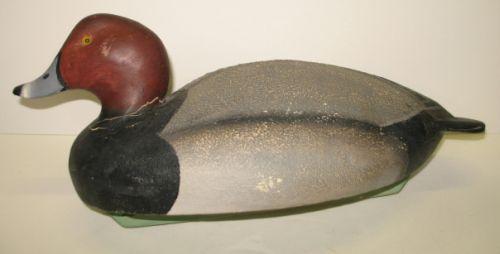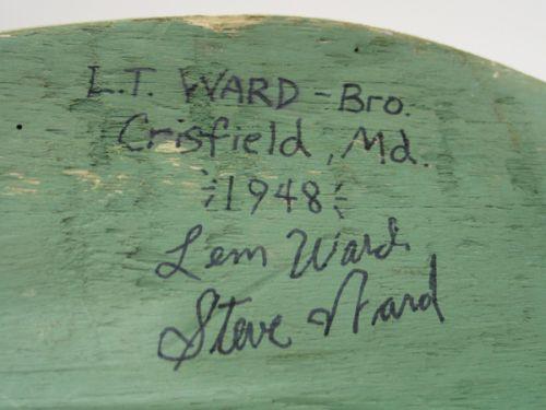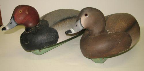 PAIR OF DONNIE BRIDDELL CRISFIELD, MARYLAND REDHEAD DECOYS. Made of balsa wood. Made by Donnie Briddell, who worked in the Ward Bros. shop as a youngster. Signed on bottom “L.T. Ward Bro.-Crisfield, Md.-1948-Lem Ward-Steve Ward”. Cracking around neck on drake. Minor cracking around neck on hen. Hen has slightly turned head.