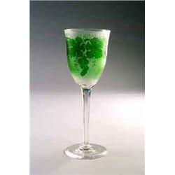 CRISTALLERIES VAL ST. LAMBERT, Val St. Lambert Weinglas, farbloses Glas. Kuppa mit grünem Außenüberfang, matt geätzte Wandung und umlaufendes Weinrankendekor mit Binnenzeichnung. Facettierter Stiel auf rundem Tellerfuß mit glockenförmiger Kuppa. H.: 20 cm. Unbezeichnet. Um 1900