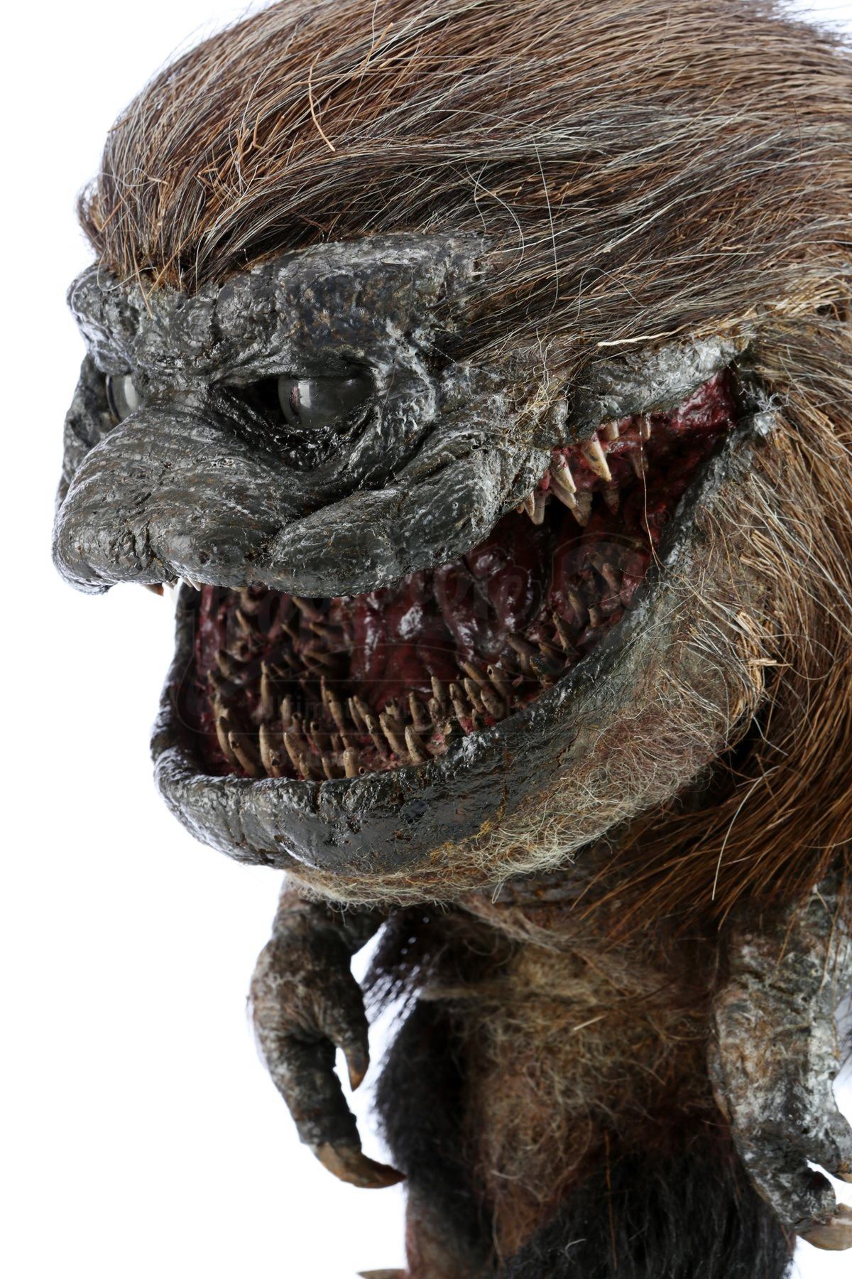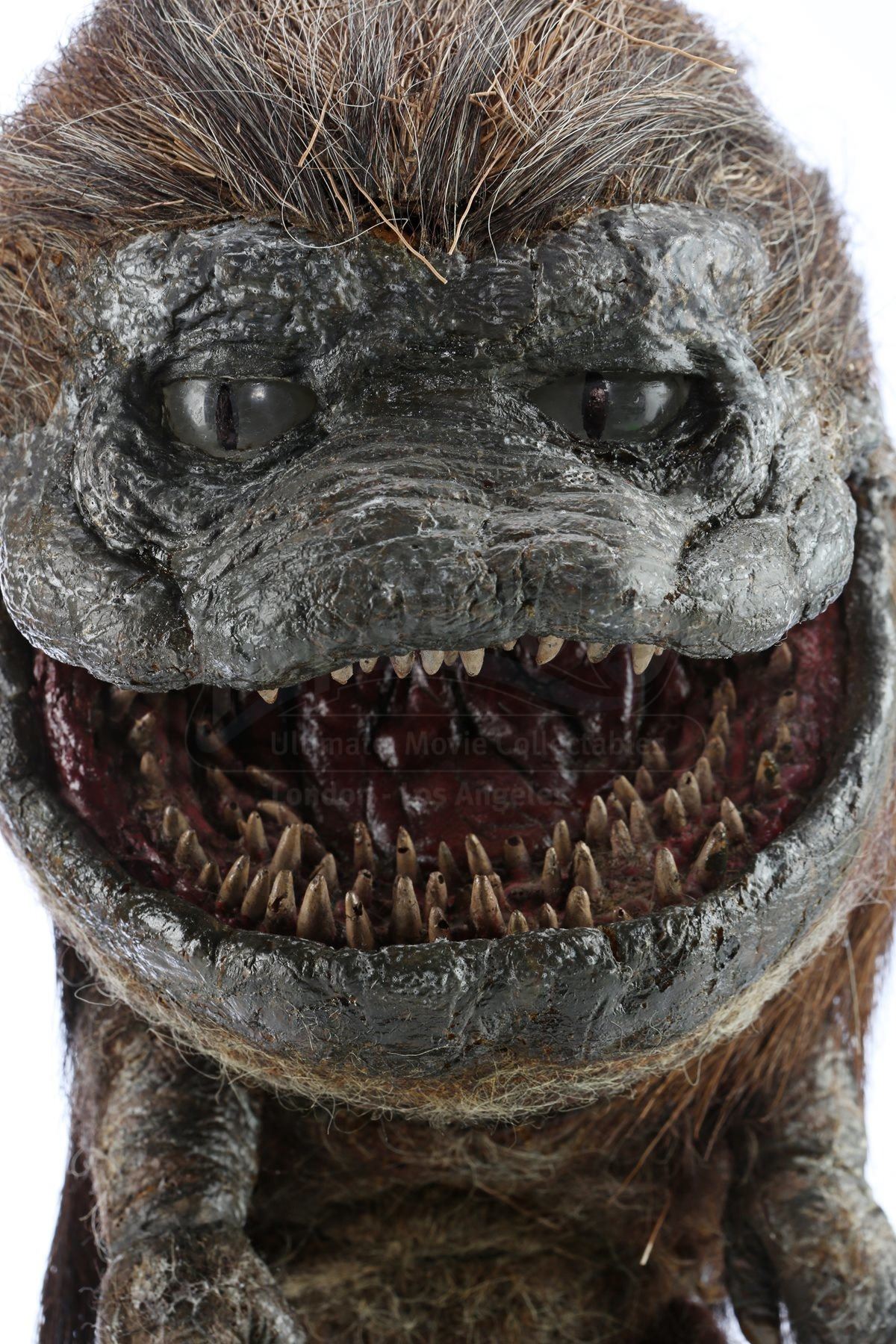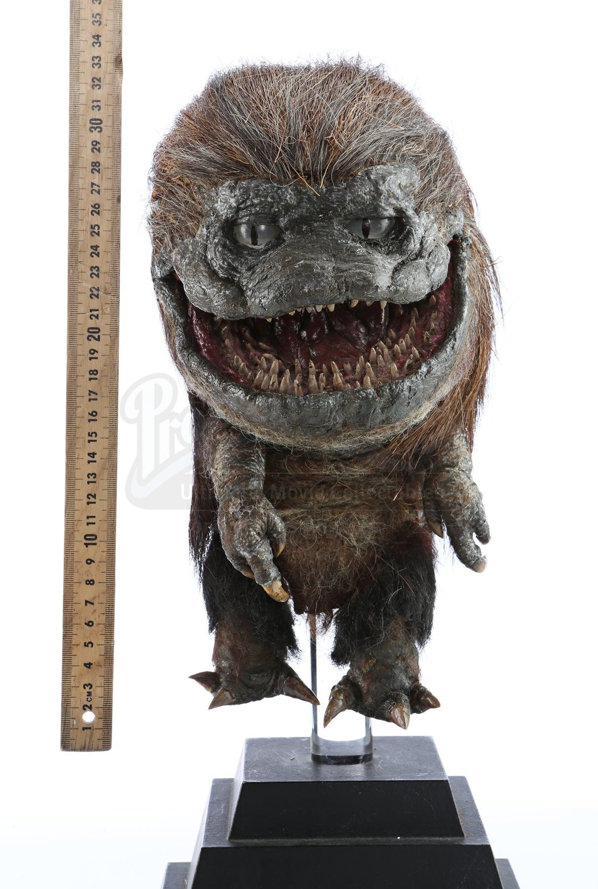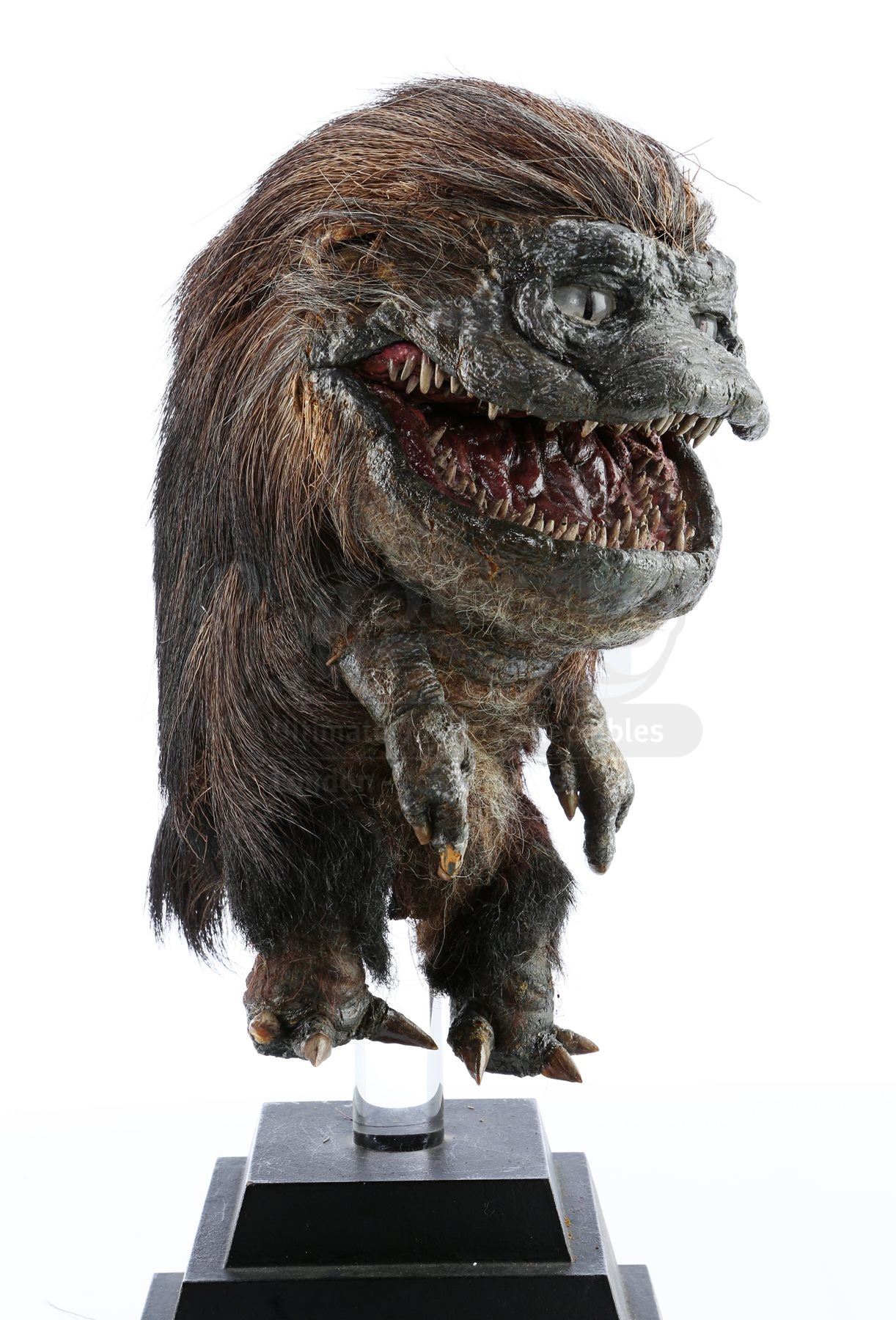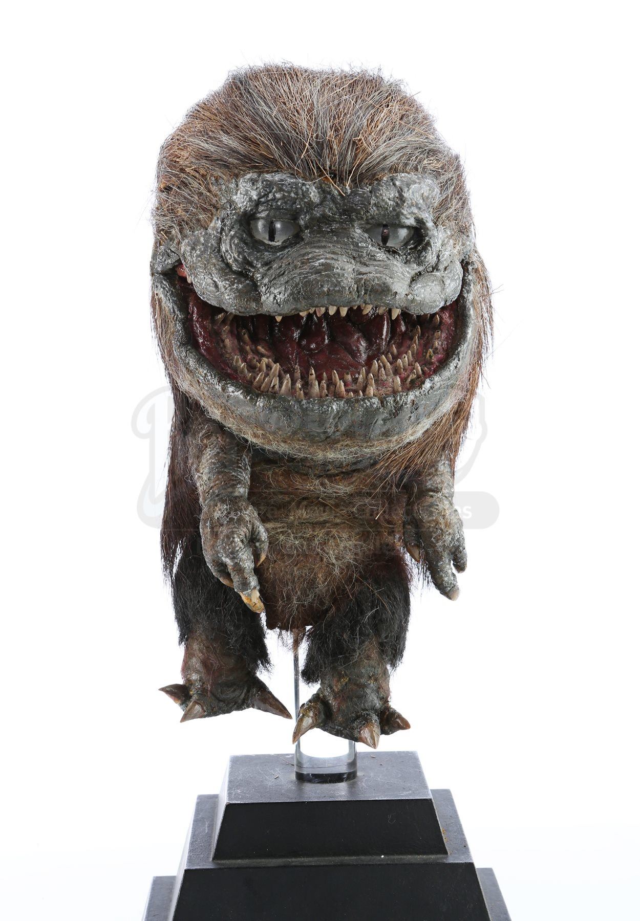 Made of foam latex, the puppet has a large hole at its bottom, from which electronic wires emerge. These wires have been tied together in order to prevent motion and preserve the piece. The puppet features a combination of hand-punched and glued-on hair. The mouth is opened and the Critter’s signature set of menacing teeth are clearly visible. Each eye is translucent and made of acrylic. In order to preserve its foam latex, the puppet has been sympathetically repaired and stabilised where needed. It shows some signs of wear from age, such as cracking and hardening to the foam, and is in fair overall condition. Dimensions: 35.5 cm x 20.5 cm x 15 cm (14” x 8” x 6”)