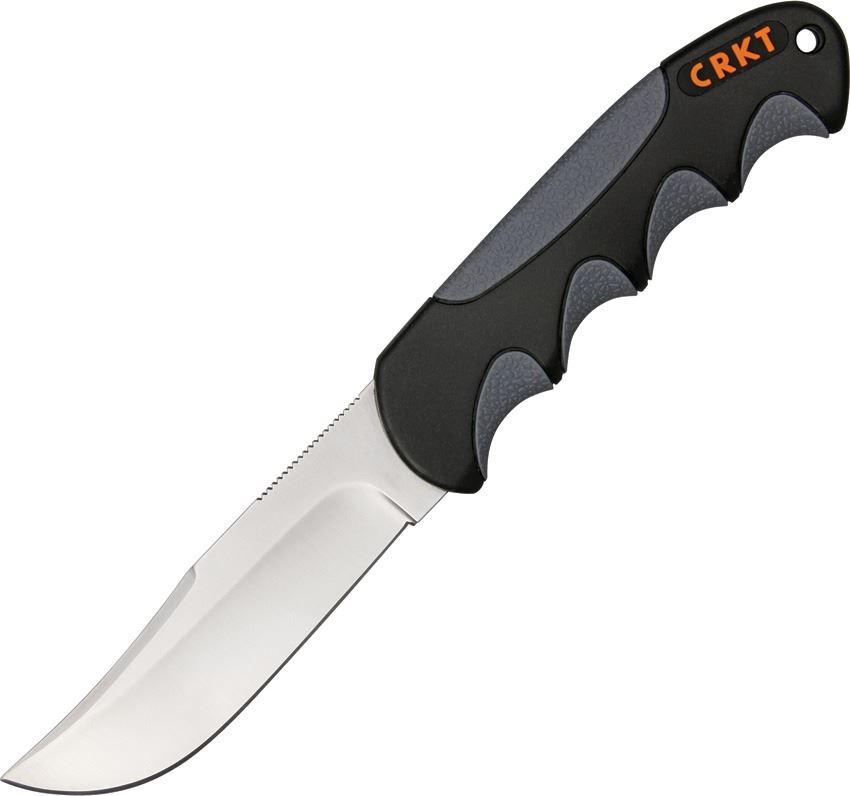 9" overall. 4" satin finish 8Cr13MoV stainless clip point blade. Black and Gray polymer handle. Lanyard hole. Black nylon belt sheath. Designed by Russ Kommer.