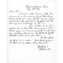 <b>565. MARCELLUS CROCKER</b> (1830 -1865) Union brigadier general who served at Shiloh and Atlanta, died of tuberculosis before war's end. Rare war-date A.L.S. 1p. 4to., "<i>Camp at Bolivar, Tenn.</i>", Aug. 19, 1862 to a colonel, in part: <i>"...I wrote a letter at once to the Gov. recommending our mutual friend Capt. Seevers. I saw today an order of the Secretary of War prohibiting the appointment of officers of the old regiments to positions in the new. Gen. Tuttle [?]...has taken command at Cairo - I am again in command of the Brigade, and am very pleasantly situated on the bank of the Hatchie about a mile from Bolivar...</i>". Near fine.<b>$400-600</b>
