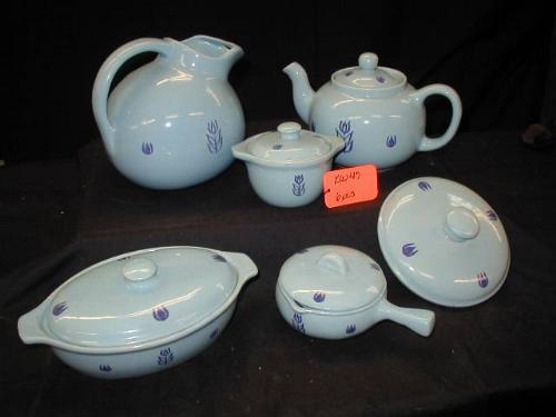 CRONIN TULIP LOT INCLUDES (1) BALL JUG 8 3/4in, (1) TEA POT 5 3/8in, (1) COVERED CASSEROLE OVAL 9in H TO H 5 1/2in DIA.,(1) COVERED FRENCH CASSEROLE W/SPOUT 4 1/4in, (1) DBL TAB HND. SUGAR, (1) COVER 6 1/4in, EXCELLENT, 6 PCS