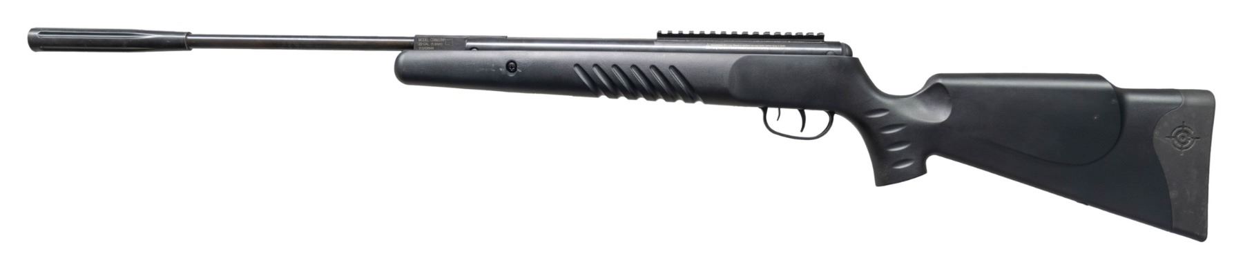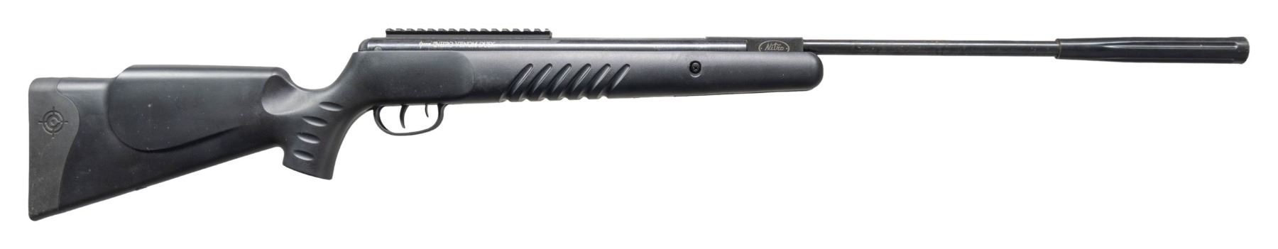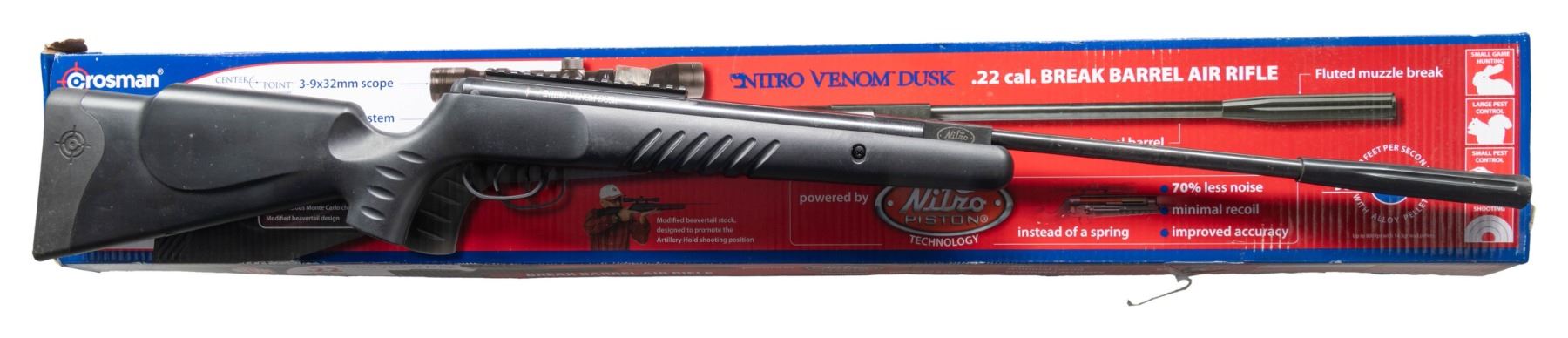 SHOT AIR PELLET RIFLE WITH FACTORY BOX. Cal. .177. S# 315X06849. Bbl. 18". Model CD8M22NP Nitro Venom Dusk single shot air pellet rifle mfg. in China for Crosman. Left side of the bbl. breech is marked with the model and cal. designations above the S# and "Made in China". Metal components exhibit a blue finish overall. 1-piece grooved black synthetic Monte Carlo pistol grip stock with Crosman black rubber recoil pad. Top of receiver features a picatinny scope rail. UNATTACHED ACCESSORIES: factory box. CONDITION: metal components retain the vast majority of their original blue finish, showing some light superficial handling marks and a some small spots of light surface oxidation. Stock is excellent. Box shows mild exterior wear, but otherwise remains sound. (02-24384/MLW). NON-GUN. $100-200.