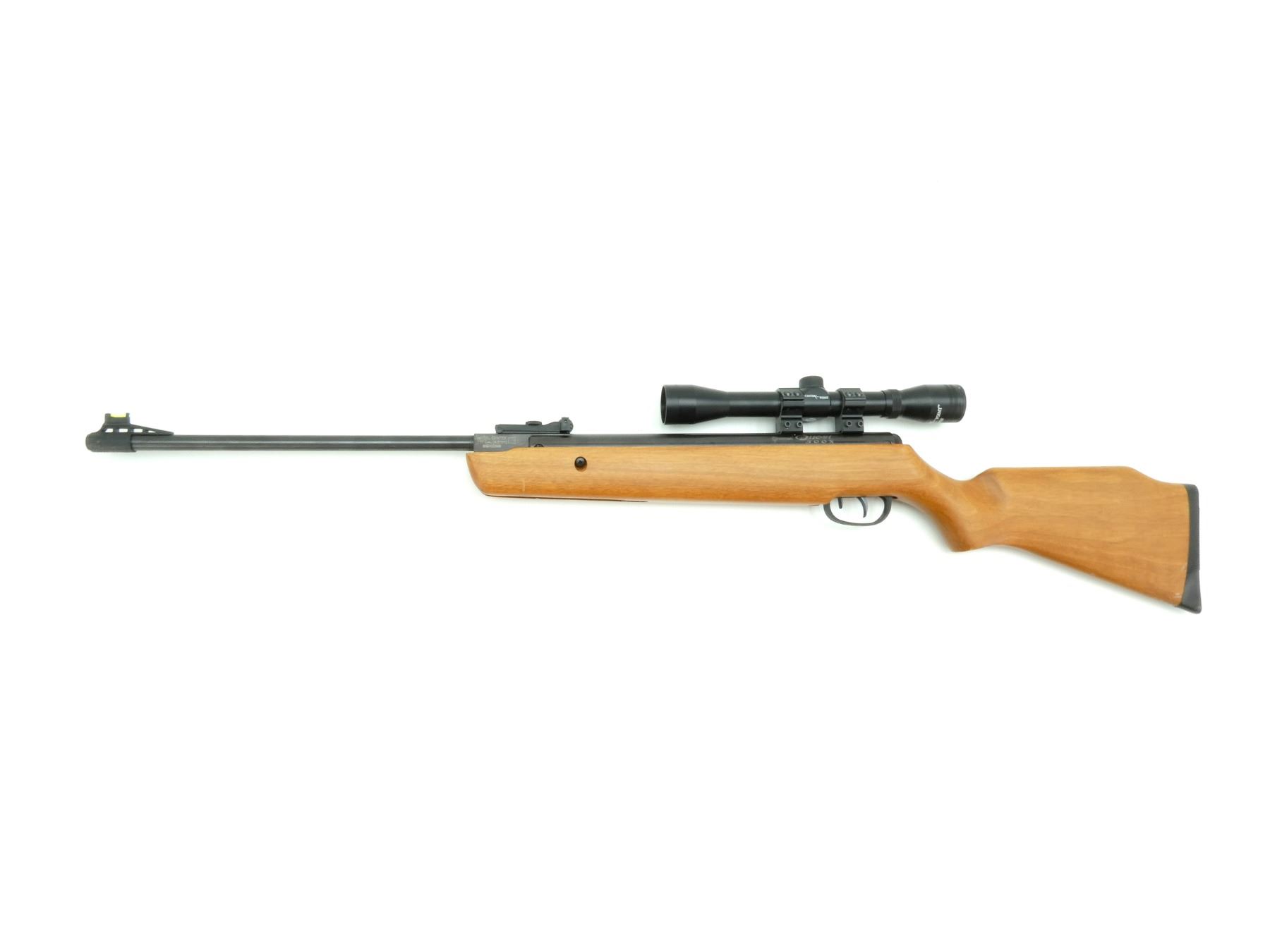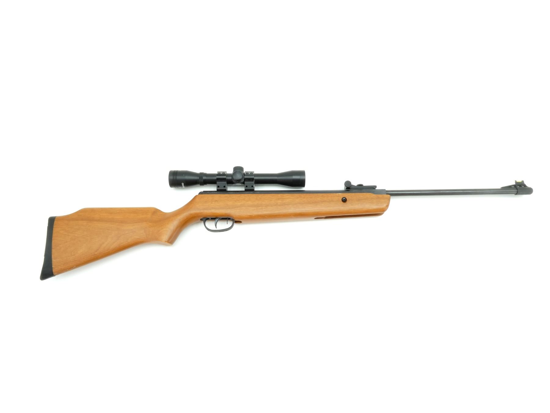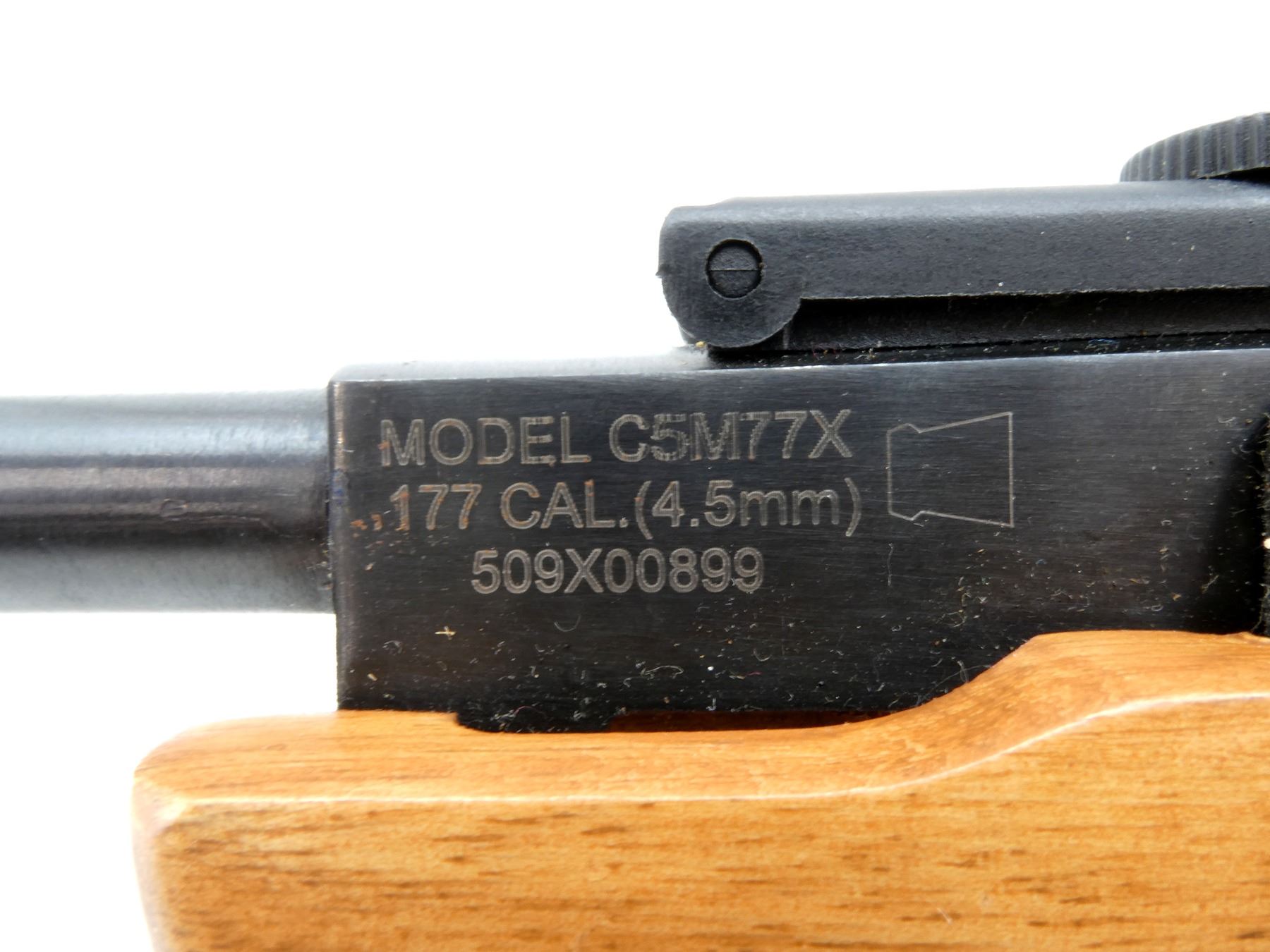 (1) .177 CAL PELLET, MODEL C5M77X, SPRING / AIR POWERED, SINGLE SHOT, BREAK ACTION, STEEL & WOOD CONSTRUCTION, SERIAL NO. 509X00899, NO COCKING ISSUES, NOT FULLY TESTED, WITH CENTER POINT SCOPE MOUNTED, CLEAR OPTICS, DUPLEX RETICLE, 1" TUBE DIAMETER, SHOWS LIGHT WEAR / TEAR. SEE PHOTOS.