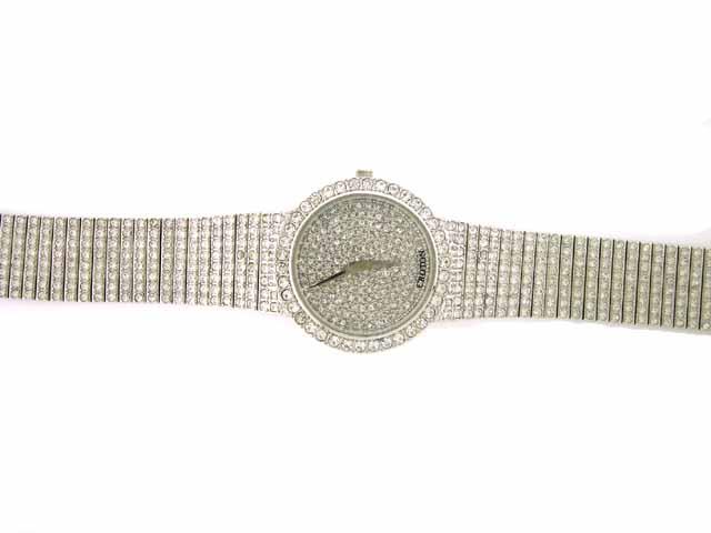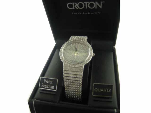 This is Croton Balliamo Watch (CN207242) for Ladies. The watch is water resistant to 1 ATM (33 feet). It has a Push/Pull Crown with a Brass/Rhodium/Silverton Round Case. The band's width is 17.3 mm (7 1/2 inches). The clasp is a jewelry clasp and the beze