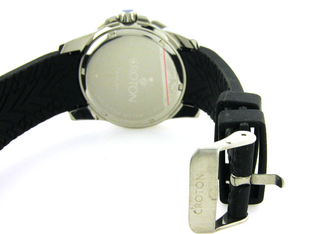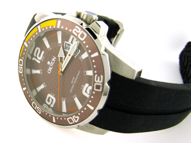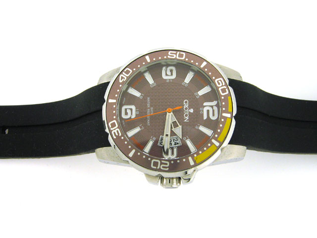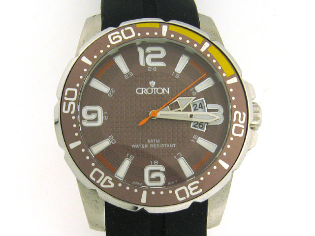 This is a Men's Croton Rubber Date watch with the following features: All stainless steel; Analog display; luminous hands and hour markers; date at 3:00; rotating bezel; rubber band; buckle clasp; Japan quartz movement; and Water resistant.