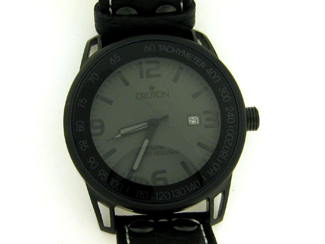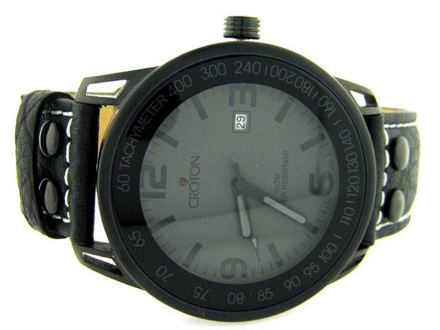 This is a CROTON MENS WATCH TACHYMETER MILITARY DATE BLACK SS with the following features: Quartz movement; Black leather band with black buckle with CROTON name and logo; Black dial; 43 mm case diameter; and Water resistant.
