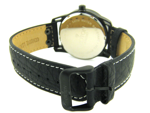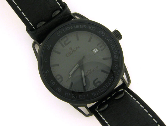 This is a CROTON MENS WATCH TACHYMETER MILITARY DATE BLACK SS with the following features: Quartz movement; Black leather band with black buckle with CROTON name and logo; Black dial; 43 mm case diameter; and Water resistant.
