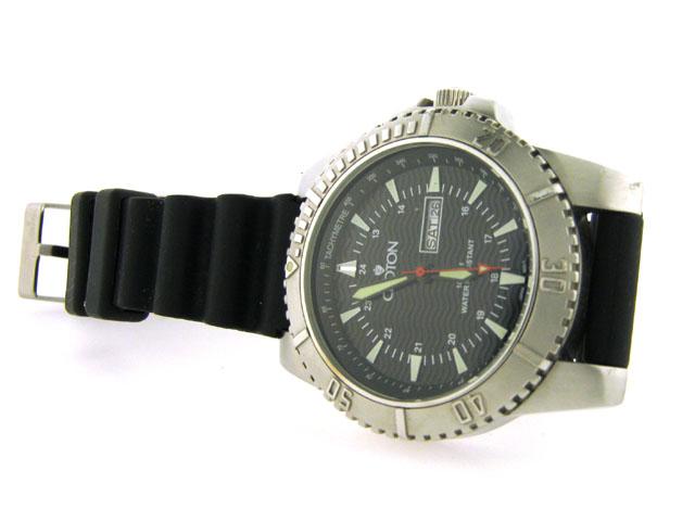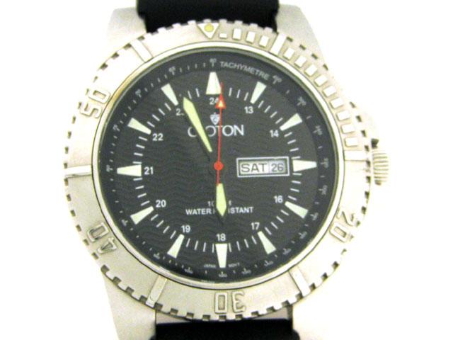 TACHYMETER BLACK RUBBER STRAP with the following features: black dial with tachymeter; Japan quartz movement; silver tone luminous hand and markers; sweep second hand; All stainless steel; Croton embossed crown; date and date at 3:00; rotating bezel; mineral crystal; water resistant; and black rubber with Croton embossed tang buckle.
