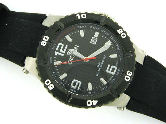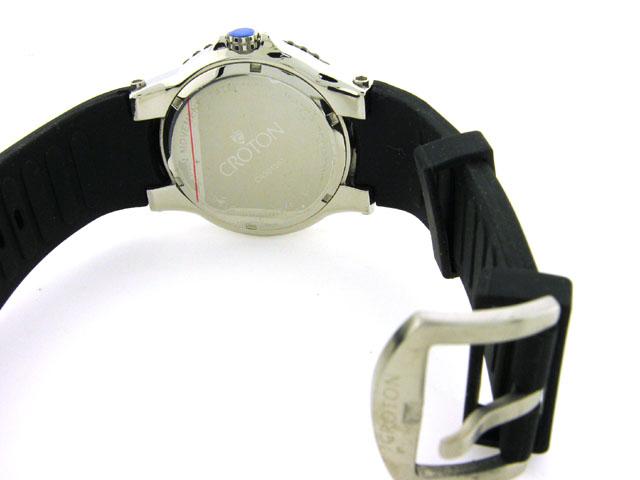 TACHYMETER BLACK RUBBER STRAP with the following features: black dial with tachymeter; Japan quartz movement; silver tone luminous hand and markers; sweep second hand; All stainless steel; Croton embossed crown; date at 3:00; rotating bezel; mineral crystal; water resistant; black rubber with Croton embossed tang buckle; and 46 mm case diameter.