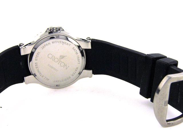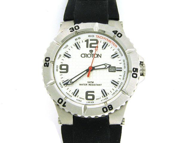 This is a CROTON TACHYMETER BLACK RUBBER STRAP with the following features: white dial with tachymeter; Japan quartz movement; silver tone luminous hand and markers; sweep second hand; All stainless steel; Croton embossed crown; date at 3:00; rotating be