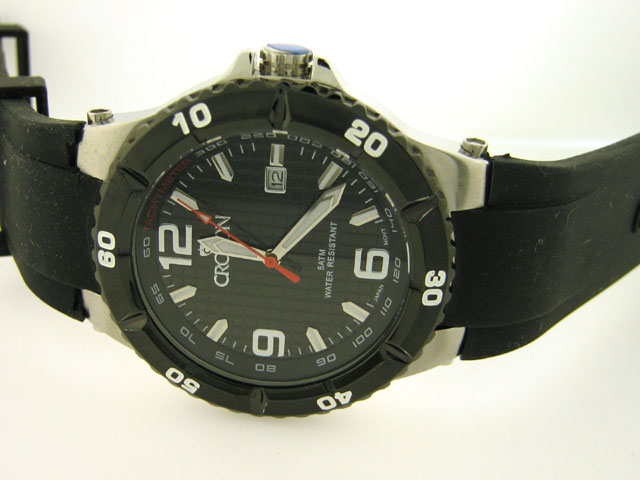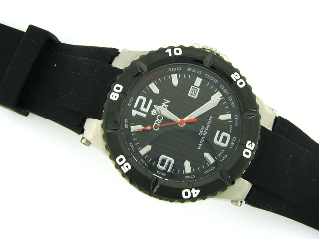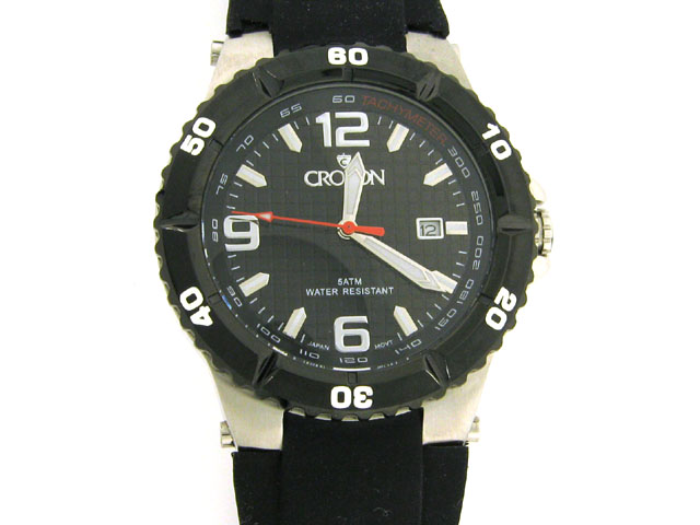 TACHYMETER BLACK RUBBER STRAP with the following features: black dial with tachymeter; Japan quartz movement; silver tone luminous hand and markers; sweep second hand; All stainless steel; Croton embossed crown; date at 3:00; rotating bezel; mineral crys