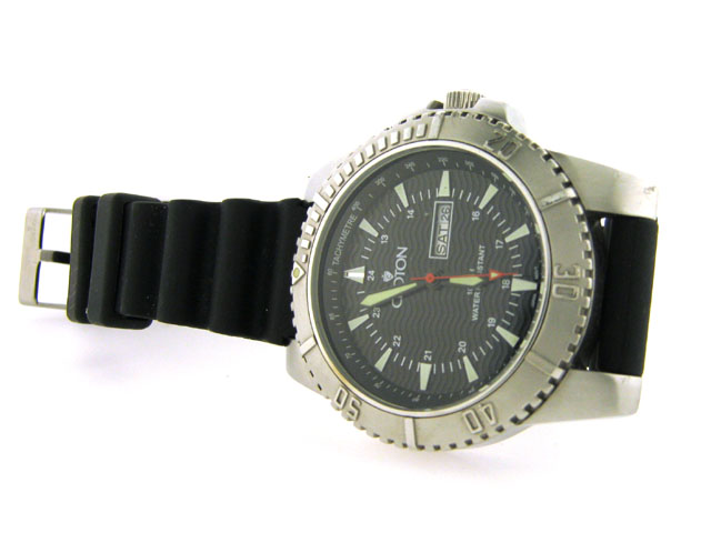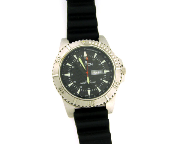 TACHYMETER BLACK RUBBER STRAP with the following features: black dial with tachymeter; Japan quartz movement; silver tone luminous hand and markers; sweep second hand; All stainless steel; Croton embossed crown; date and date at 3:00; rotating bezel; min