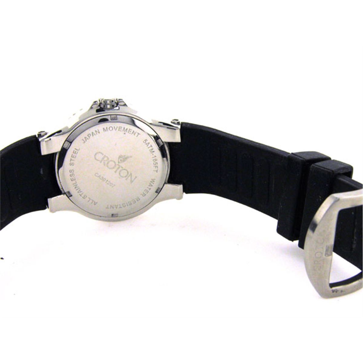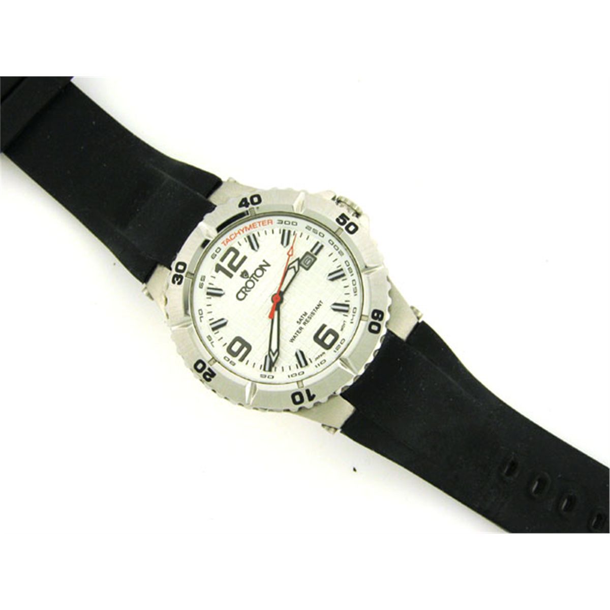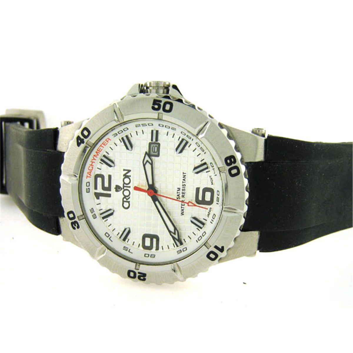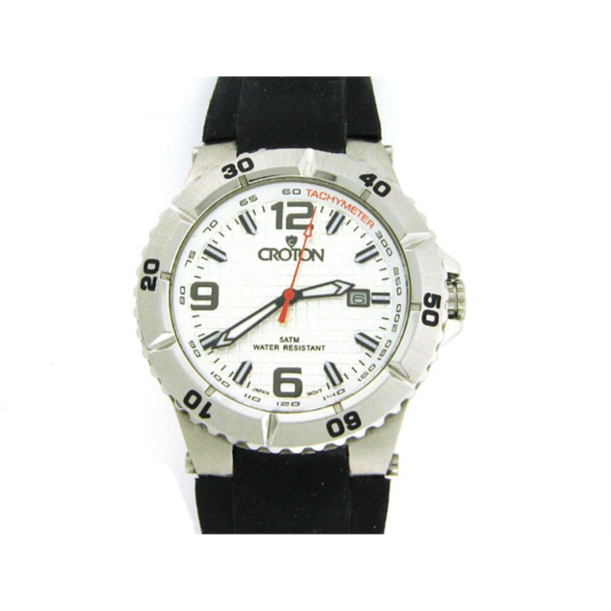 This is a CROTON TACHYMETER BLACK RUBBER STRAP with the following features: white dial with tachymeter; Japan quartz movement; silver tone luminous hand and markers; sweep second hand; All stainless steel; Croton embossed crown; date at 3:00; rotating bezel; mineral crystal; water resistant; black rubber with Croton embossed tang buckle; and 46 mm case diameter.