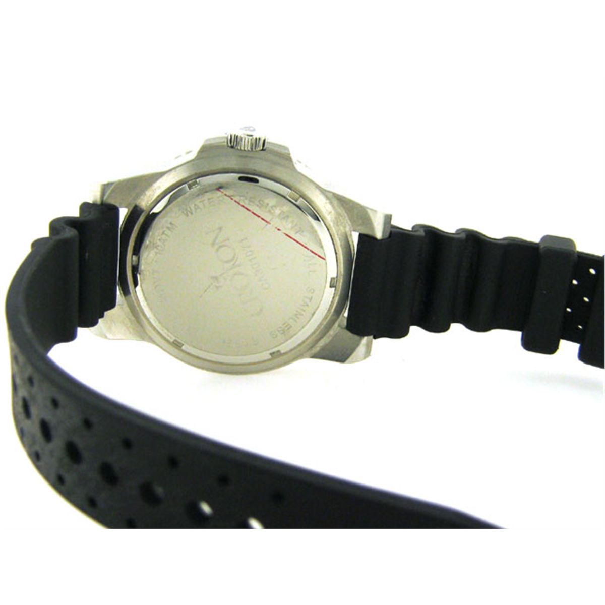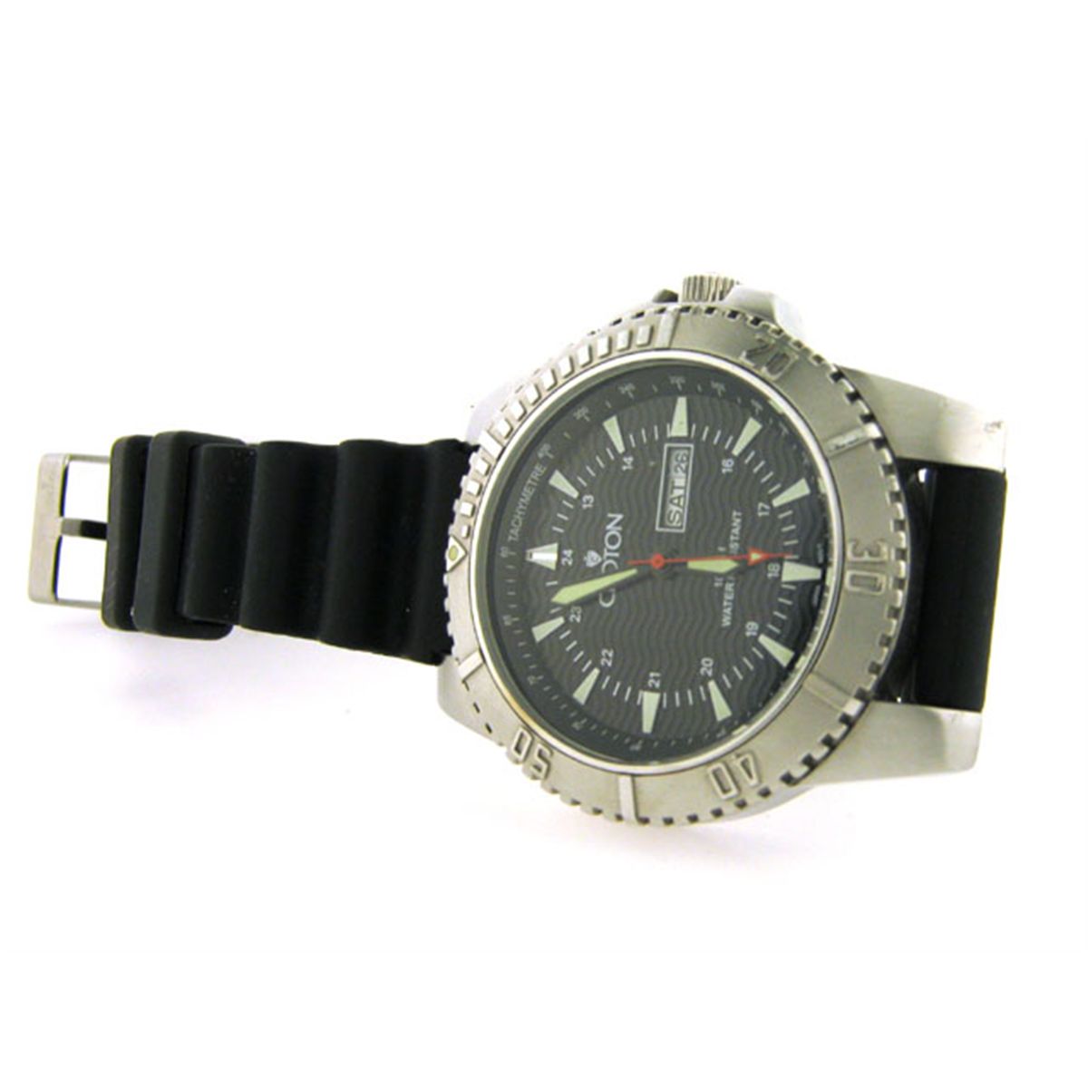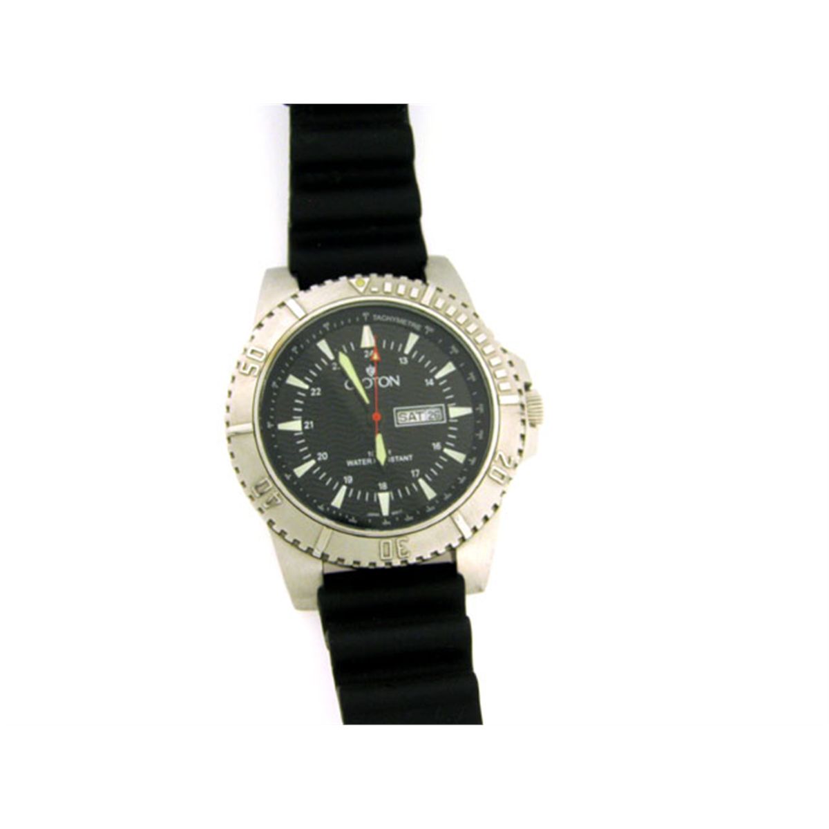 TACHYMETER BLACK RUBBER STRAP with the following features: black dial with tachymeter; Japan quartz movement; silver tone luminous hand and markers; sweep second hand; All stainless steel; Croton embossed crown; date and date at 3:00; rotating bezel; mineral crystal; water resistant; and black rubber with Croton embossed tang buckle.
