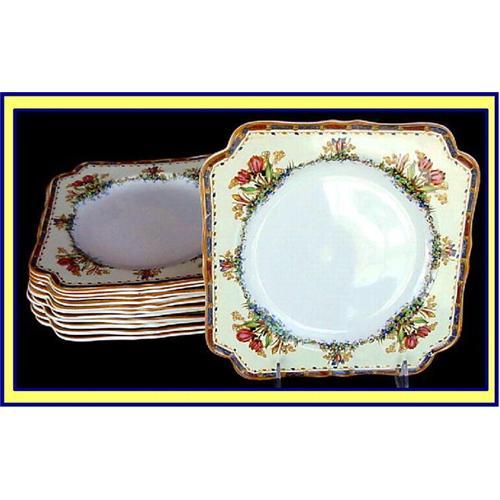 12 superbly enamelled luncheon plates, made by Crown Ducal, England, early 20th century.<BR>Square shape with canted corners. Measure 7 1/2inches accross. Edges are curly. <BR>Magnificent hand enamelled tulip & freesia decoration on a pale yellow ground. Borders are in mustard yellow, blue and red. Mustard yellow enamelling is used on the rims of all pieces.<BR>Each piece is marked CROWN DUCAL WARE ENGLAND (not Made in England) and has various marks, presumably of the enameller, painter and modeller.<BR>Very good, unused condition. Minor crazing typical of English porcelain but no damage.<P><BR>Part of a dinner and tea service that we have divided into seperate groups because of disparate numbers. All available separately.