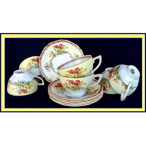 Superbly enamelled 6 pairs of cups and saucers, made by Crown Ducal, England, early 20th century.<BR>Saucer is 5 7/8inch in diam. Cup is 2 1/4inches high and 3 3/4inches in diam on the top. <BR>Magnificent hand enamelled tulip & freesia decoration on a pale yellow ground. Borders are in mustard yellow, blue and red. Mustard yellow enamelling is used on the rims of all pieces.<BR>Each piece is marked CROWN DUCAL WARE ENGLAND (not Made in England) and has various marks, presumably of the enameller, painter and modeller.<BR>Very good condition. One cup has a fleabite chip on the rim - easilly restored..<P><BR>Part of a dinner and tea service that we have divided into seperate groups because of disparate numbers eg teapot, sugar, creamer, plates, servers, extras. All available separately.