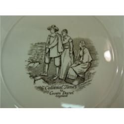 Crown Ducal plate. England. Black transferware. "The First Thanksgiving in America" pictured with the Mayflower, an Indian, Pocahontas and Return of Mayflower. "Pilgrim Exile" on underside. 8-1/4" square with scalloped corner. Condition: Excellent