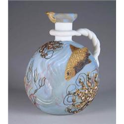 Lot 9 CROWN MILANO EWER Extremely rare aquatic life ewer. Background is decorated to represent water and coral with applied decoration of fish, shells, and coral. Rare applied glass rope handle..  SIZE: 10” t.  CONDITION: Very good to excellent.  5-70364
