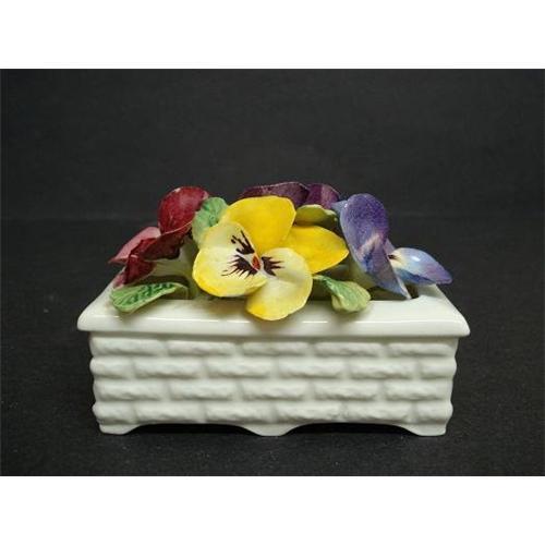 LOVELY GROUPING OF CHINA FLOWERS, PANSY BLOSSOMS, HAND MODELLED AND HAND PAINTED BY CROWN STAFFORDSHIRE,ENGLAND, ENTITLED "SEPTEMBER", DEPICTING BRICK "BOX" FULL OF FLOWERS, measuring about 3 3/4 x 2 x 2 3/4 inch high, US Buyer please remit 7.00 for shipping plus insurance.THANKS.
