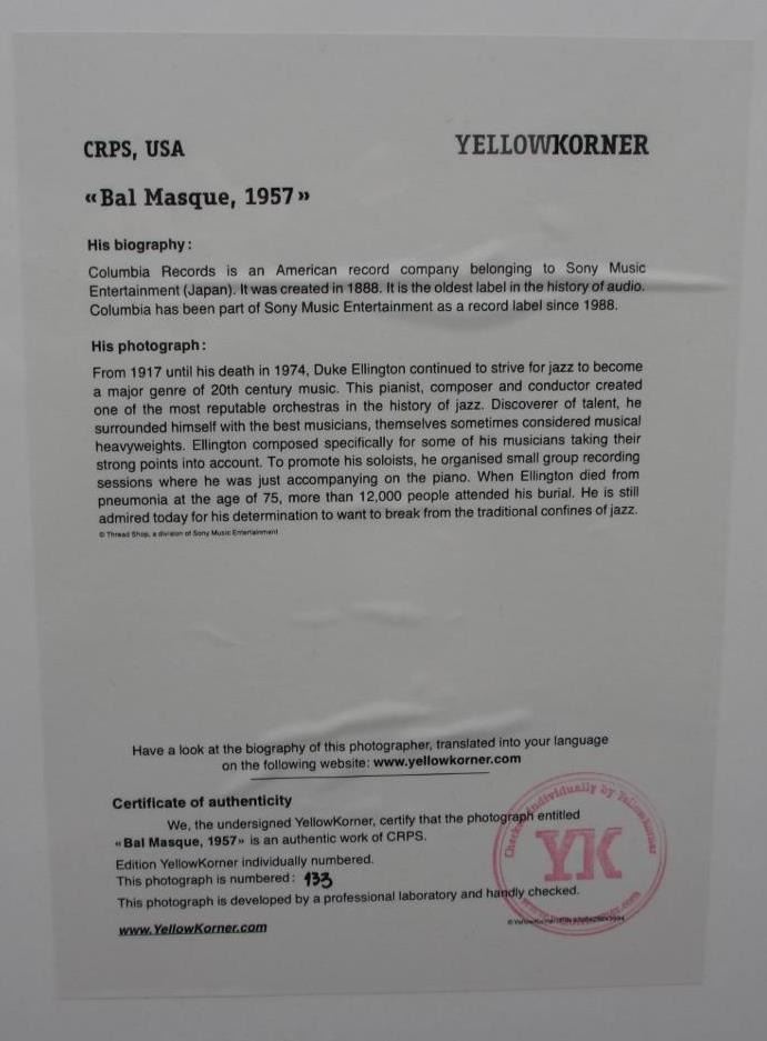 Duke Ellington Bal Masque Certified Photograph, CRPS YellowKorner Certified Photograph. Certificate of Authenticity from YellowKorner affixed to the back. Matted Dimensions 16"x20". Protected with Clear Mylar Sleeve.