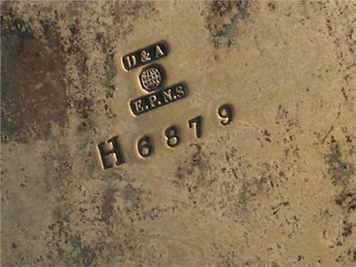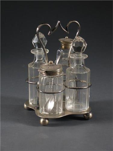 Cruet set with silver plate rack marked ''D&A EPNS'', four clear glass items, two with silverplate mounts, early 20th c. Chips to stoppers and necks of bottles, undersides of bottles. Rack with handle 8'' H