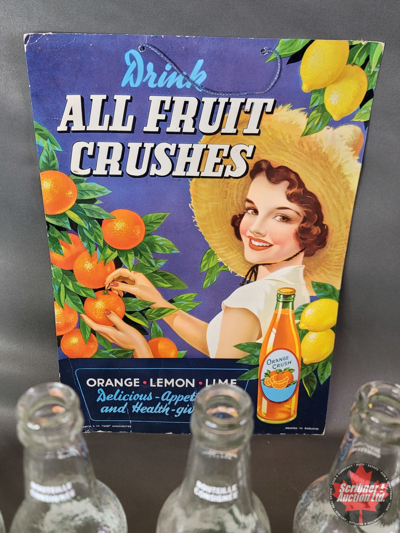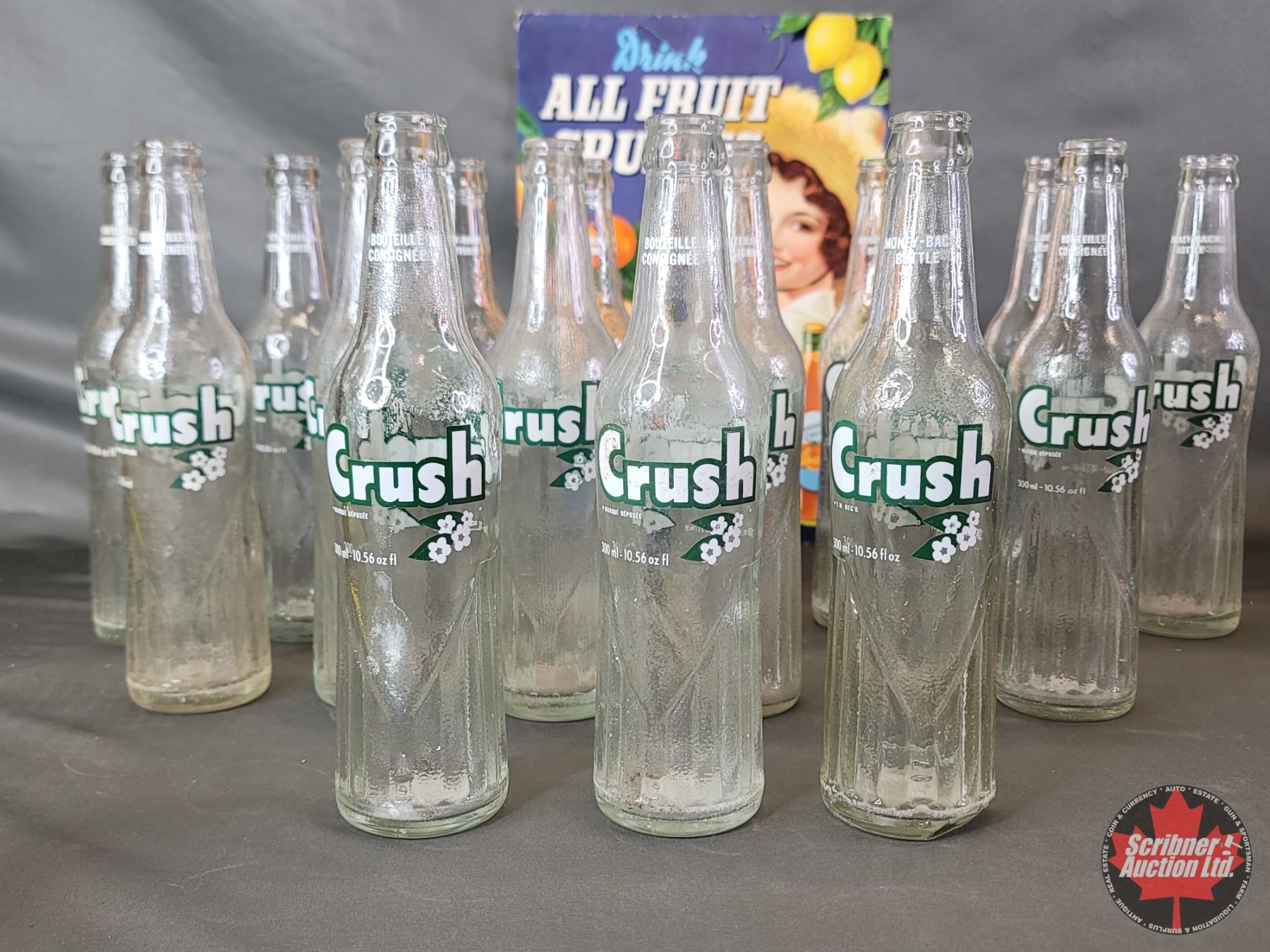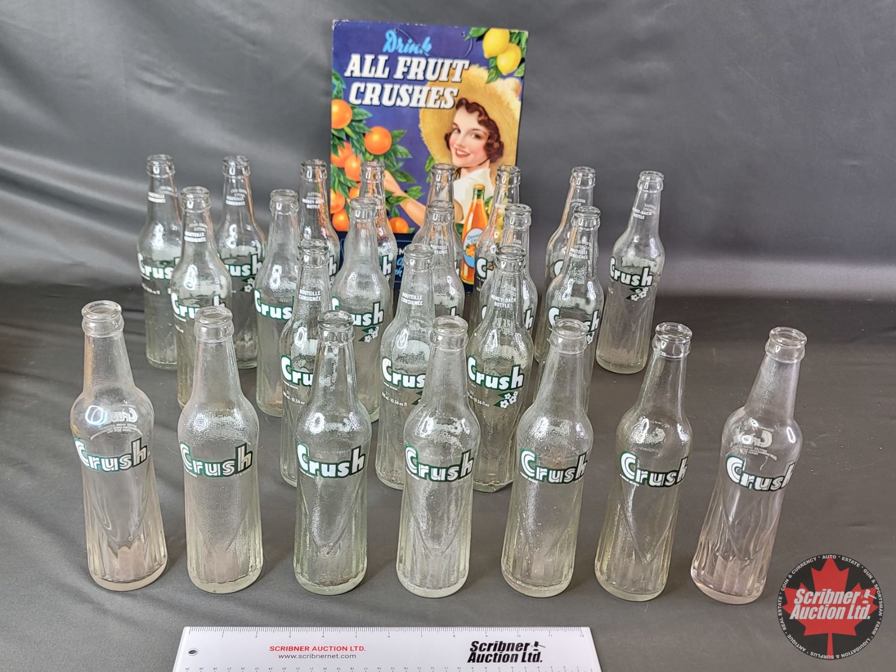 CRUSH Bottle Collection (24) + Vintage Crush Cardboard Ad (13-1/2" x 9-1/2") (SEE PICS!)