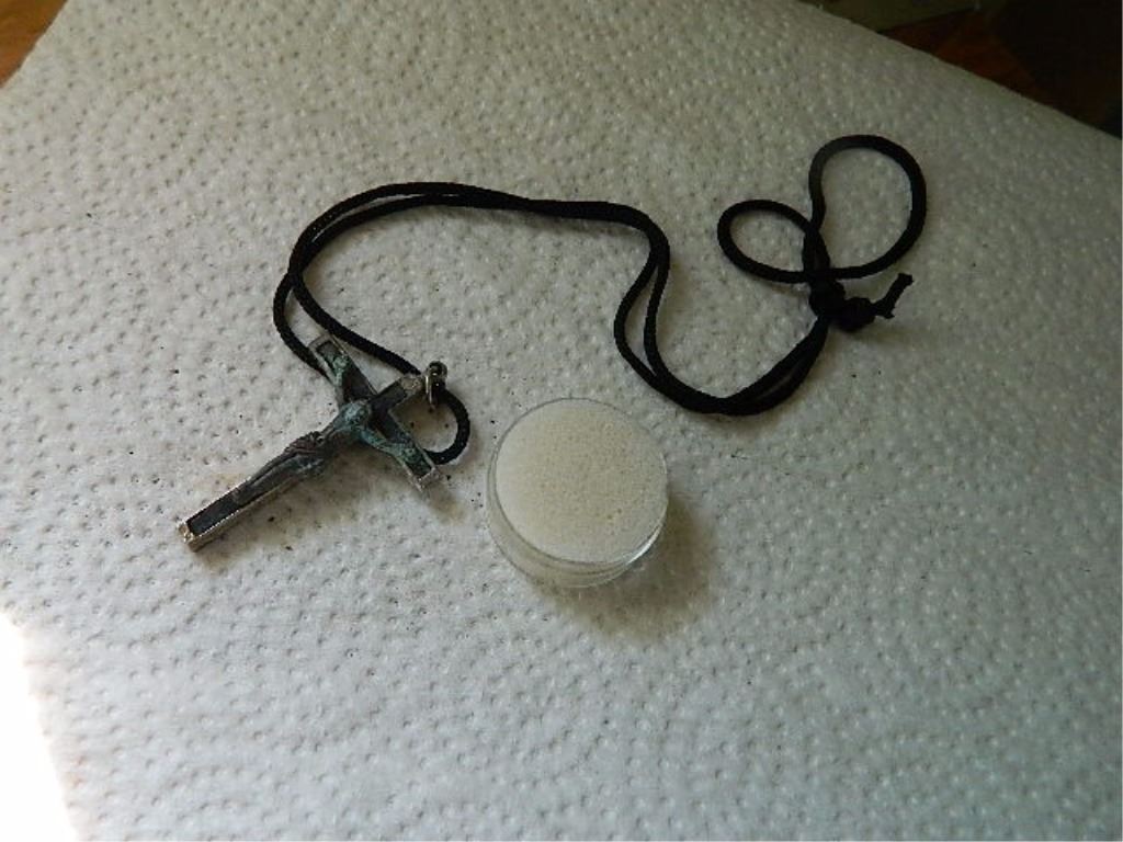 CRUSIFIX WHISTLE - ON ROPE - WHISTLE - but not whistling - needs cleaning - "PROTECT GOD " ON THE BACK - 2 1/4" TALL - NON FEROUS