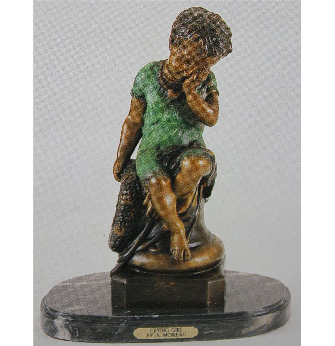 "CRYING GIRL" BRONZE SCULPTURE - AFTER A. MOREAU - BEAUTIFUL COLOR PATINA - MOUNTED ON A FINE ITALIAN MARBLE BASE - BEAUTIFULLY DETAILED - SIGNED - MINT CONDITION - 20"H X 16"W - LOST WAX CAST BRONZE