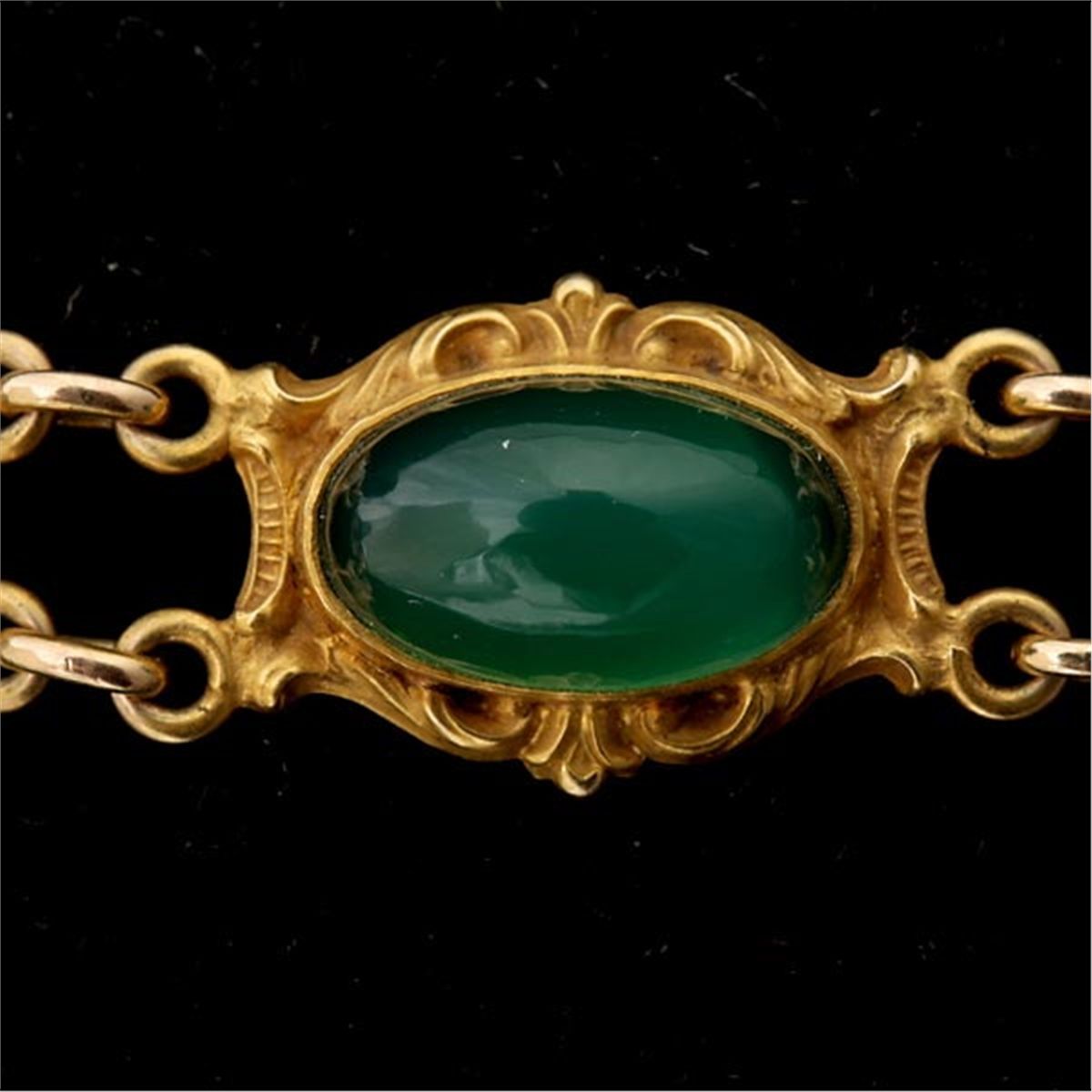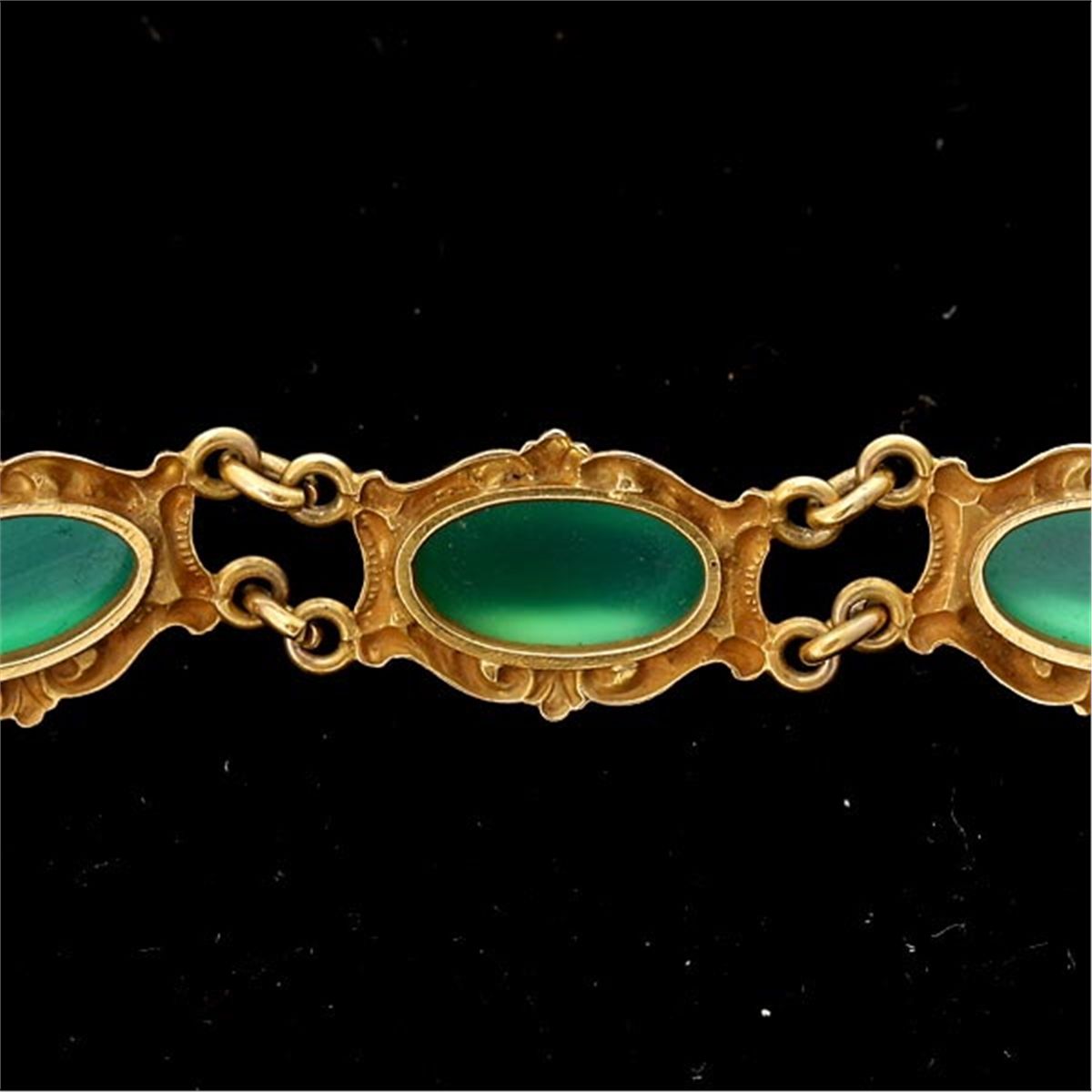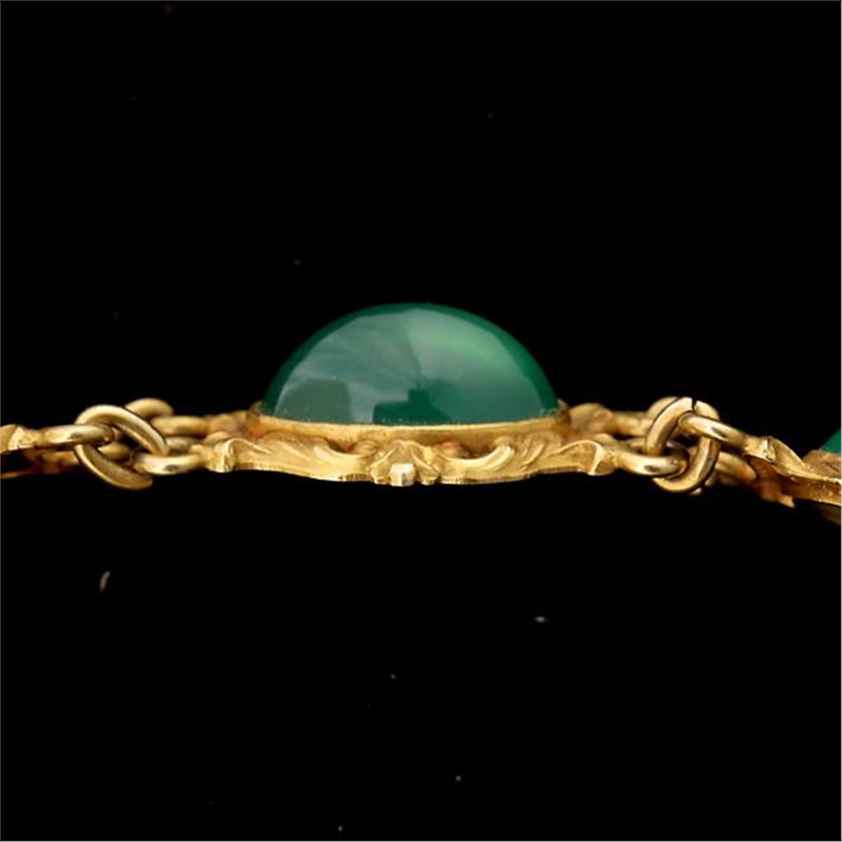 CRYSOPHRASE, 10K YELLOW GOLD BRACELET. Featuring six oval chrysophrase cabochons, bezel set in 10k yellow gold. 7.30 dwts