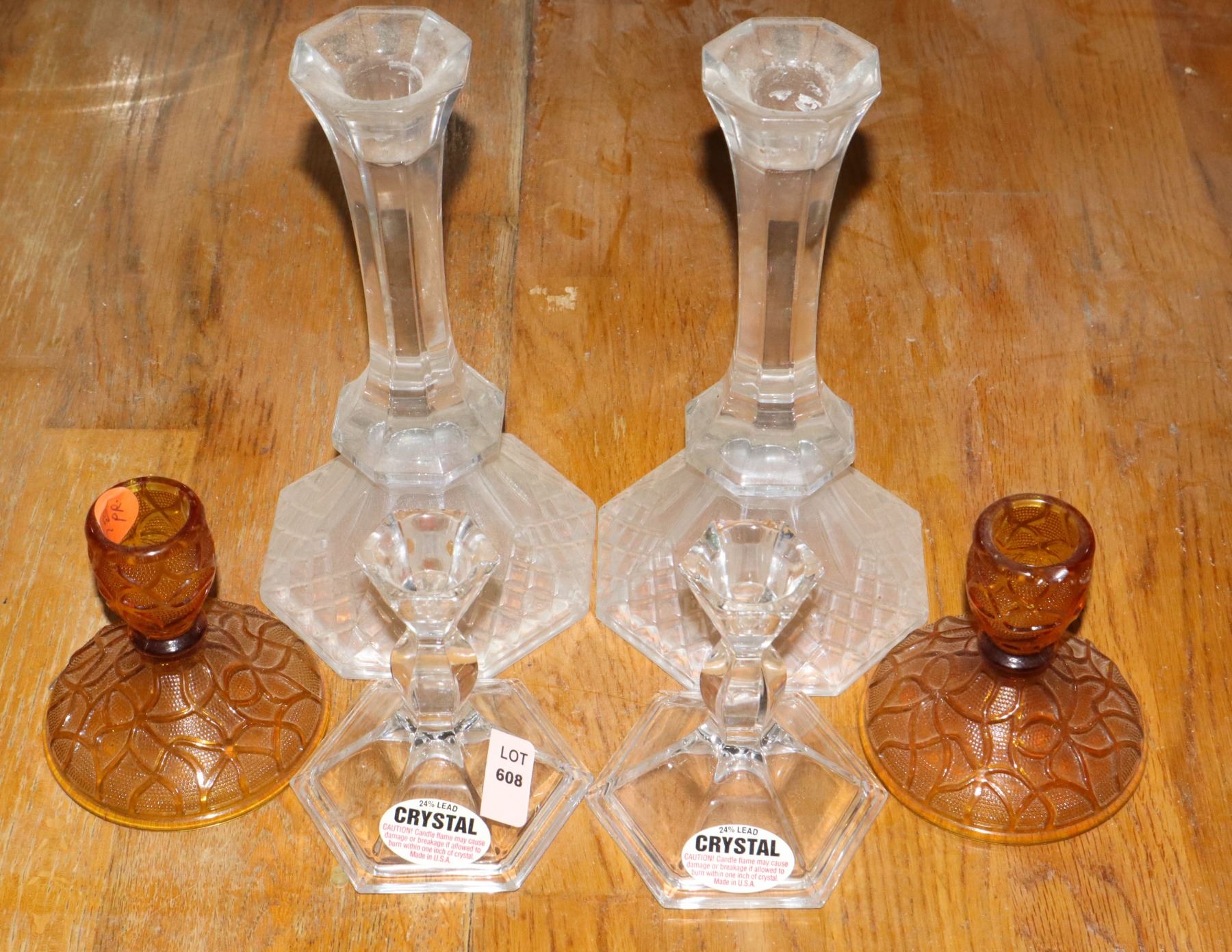 CRYSTAL AND AMBER GLASS CANDLE HOLDERS