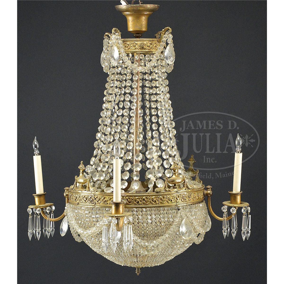 The central shaft holding a brass ring decorated with urns having four short curving arms with one light. Below ring is a dome of crystals and above draped from top ring to bottom ring with crystal strands. Other drapery crystals decorate the chandelier. SIZE: 32" h x 26" w. CONDITION: Very good, some tarnish. 9-90132