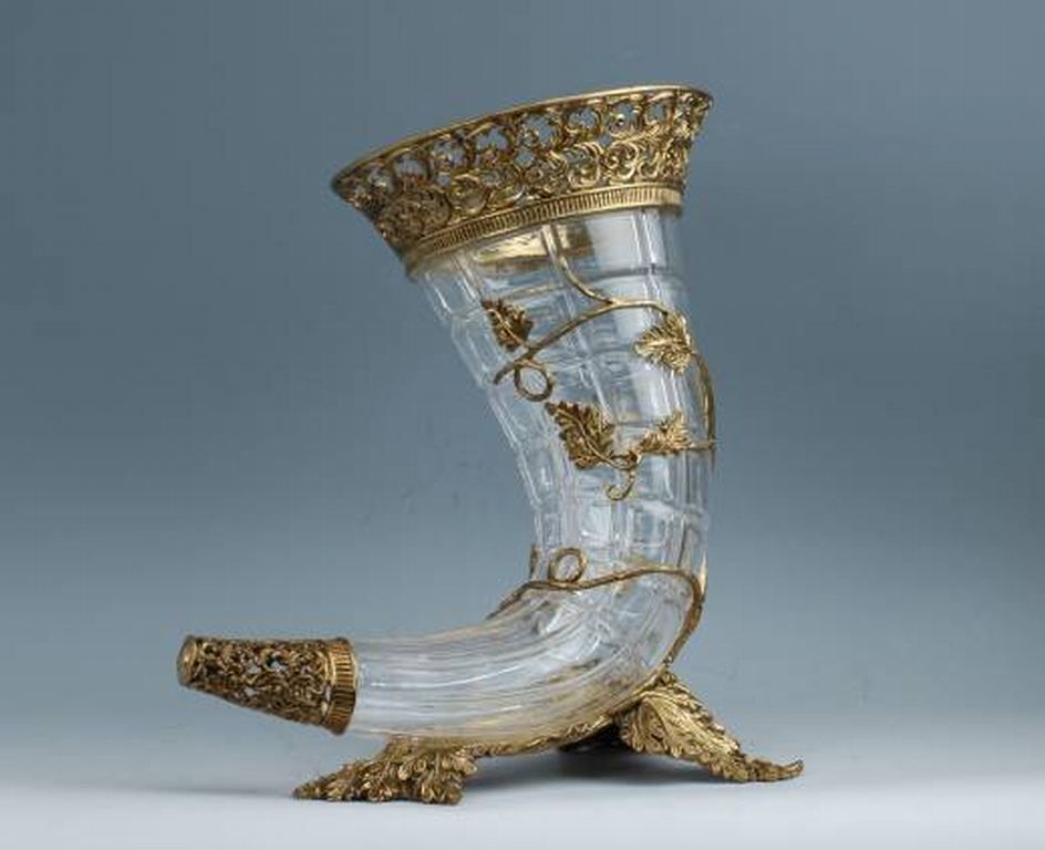 ITALIAN LEAD CRYSTAL HORN SHAPE VASE - HAND CUT CRYSTAL - BRASS ACCENTS - 13.4 W, 9.6 L, 14.5 H