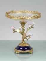 HAND CUT CRYSTAL - BRASS STEM TRIM AND BASE - HAND PAINTED PORCELAIN FLOWERS AND BIRD - 12LX12WX14H