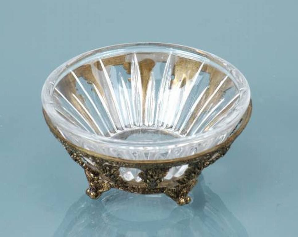 ITALIAN LEAD CRYSTAL BOWL IN BRASS BASE - HAND CUT CRYSTAL DESIGN - ORNATE CARVED BRASS BASE - BOWL IS REMOVABLE FROM BASE - 4.5L" x 4.5W" x 2.2H"