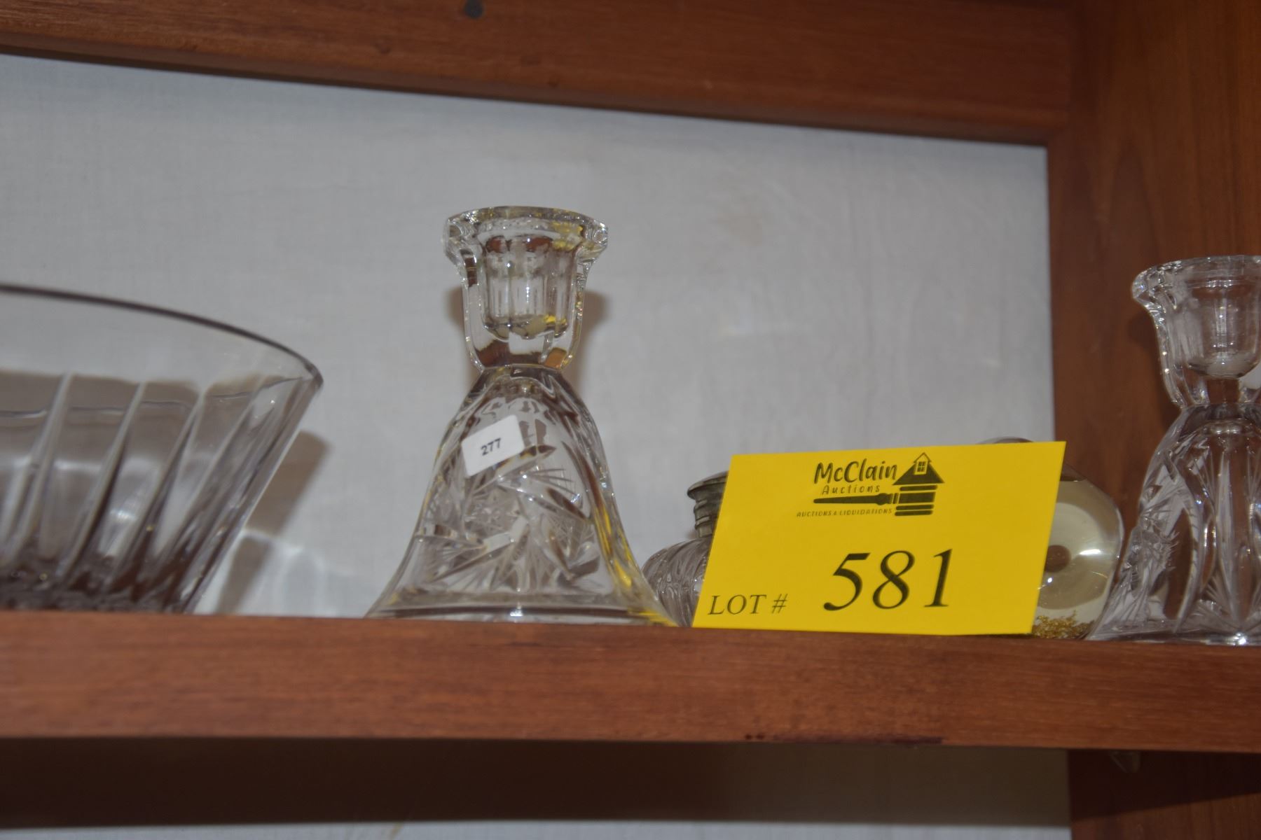 CRYSTAL BOWL (SIGNED), CANDLESTICK HOLDERS, INK WELL & PAPERWEIGHT W/GOLD FLAKES (5 PCS)