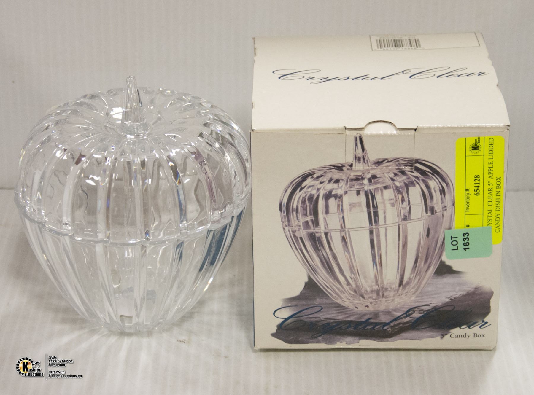 CRYSTAL CLEAR 5" APPLE LIDDED CANDY DISH IN BOX