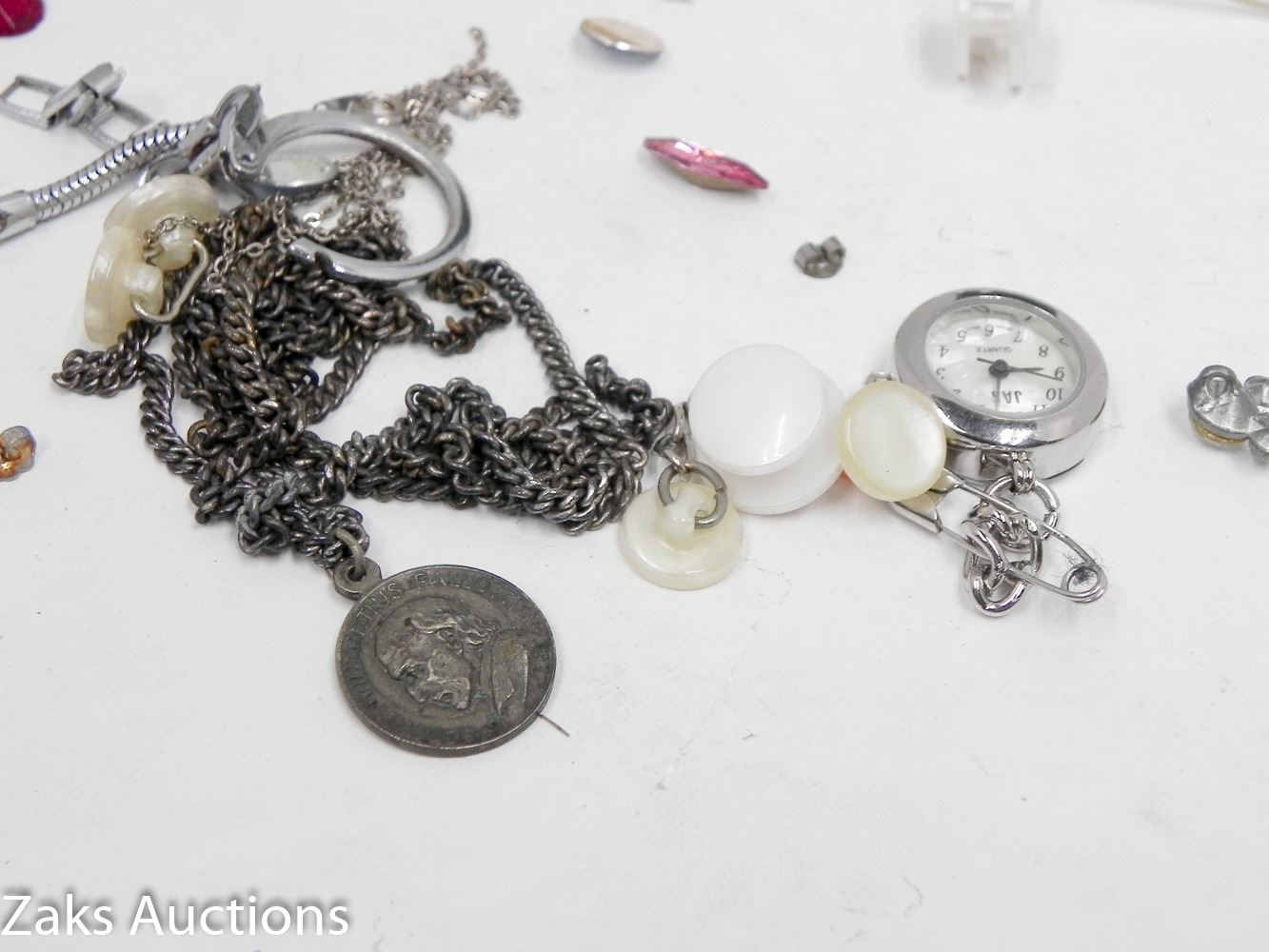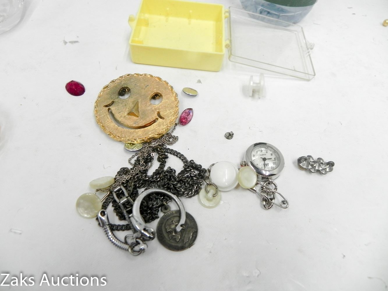 HAPPY FACE BROACH WITH GLASS STYLE EYES, JAS QUARTZ POCKET/LAPEL WATCH, ETC.