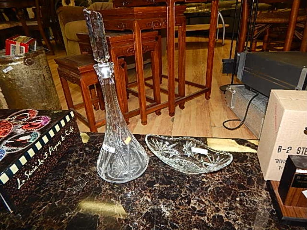 CRYSTAL DECANTER (TINY CHIPS ON TOP RIM) AND DISH