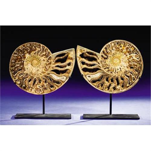<B>CRYSTAL - FILLED AMMONITE </B></I><BR> <I>Pachydiscus species <BR>Cretaceous <BR>Morondava, Madagascar </B></I><BR>Ammonites represent some of the most beautiful fossils in the world of Paleontology, and many are highly prized by collectors for their decorative appeal. This well-preserved and exotic-looking specimen is sectioned into halves and beautifully polished, the better to reveal its internal structure. Every whirling chamber is clearly visible and many are accented by golden honey-colored crystals of calcite. Each half measures 12 inches in diameter and is supported on a metal display stand. This ammonite belongs to the predaceous genus Pachydiscus, whose hydrodynamic streamlined shell was designed for swift and powerful movement. The Pachydisca, like all ammonites, are the fossil relatives of the living octopus, squid, cuttlefish and nautilus (Cephalopods); their soft anatomy may have resembled that of their modern-day living relatives, with numerous tentacles, sharp beaks and enlarged eyes. Ammonites are of central importance to the study of paleontology in that they provide a reference for determining the age of certain sedimentary rocks, and are often used for reconstructing ancient marine assemblages as well as examples in the study of evolutionary biology. They became extinct mysteriously at the end of the Cretaceous period, approximately 65 million years ago, along with the dinosaurs. <BR><BR><b>Shipping:</b> Requires 3rd Party Shipping (<a target="_blank" href="http://www.heritageauctions.com/common/shipping.php">view shipping information</a>)
