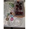 CRYSTAL & GLASS LIQUOR, CONDIMENT, SERVERS & CAKE TOPPER(S). ASSORTED- SEE PICTURES.
