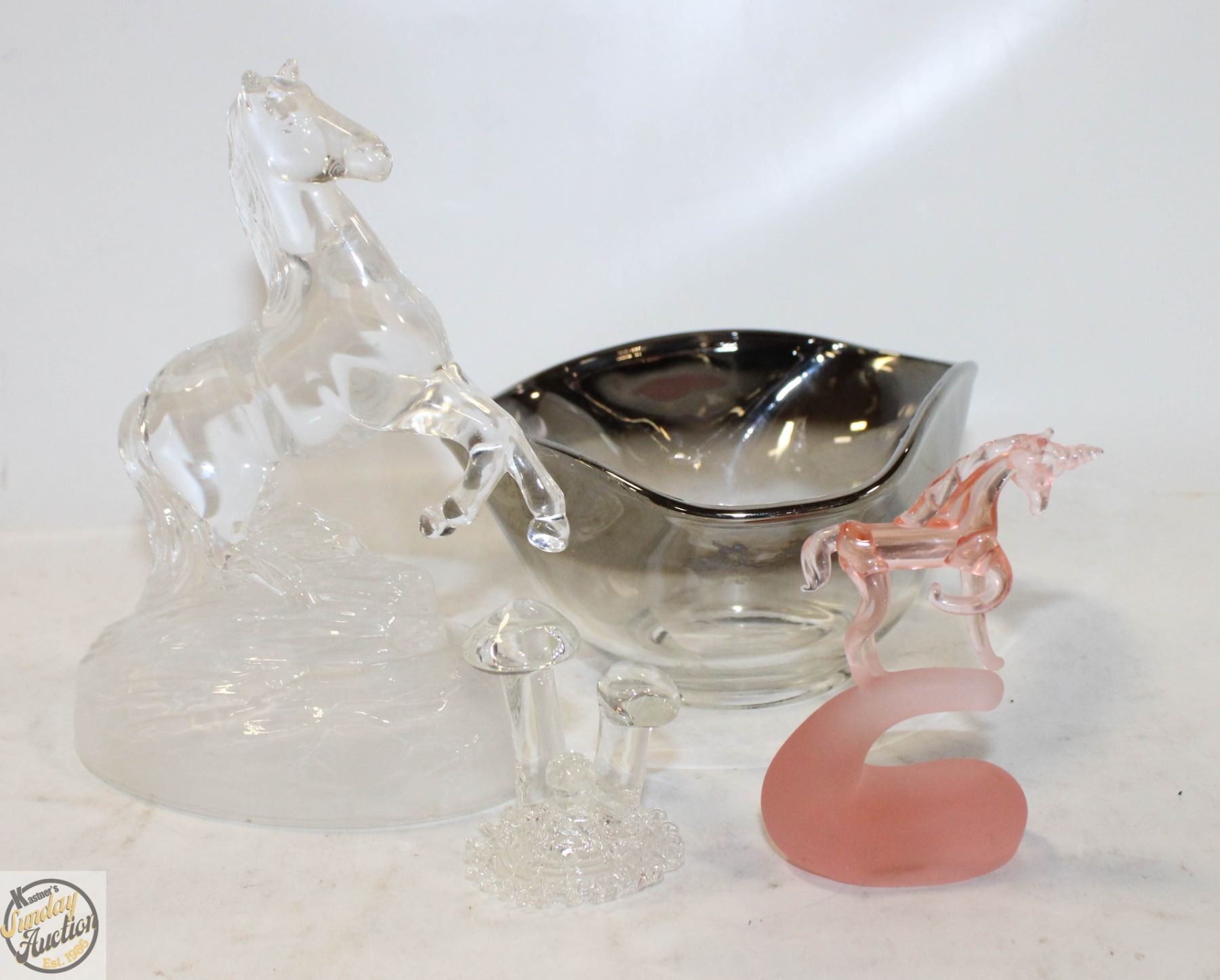 GIFT CRAFT HORSE + SILVER TRIMMED ART GLASS BOWL + ART GLASS HAND BLOWN MUSHROOMS WITH 2 NEW BLACK PLACEMATS **ALL ITEMS MUST BE REMOVED BY 5PM SATURDAY, JULY 5TH 2025. ALL REMAINING ITEMS WILL BE SUBJECT TO A $6.00 PER DAY STORAGE CHARGE. ANY ITEMS REMAINING AFTER MONDAY, JULY 21ST 2025 WILL BE CONSIDERED FORFEITED. NO REFUNDS WILL BE ISSUED FOR FORFEITED ITEMS. TO SCHEDULE A PICK UP APPOINTMENT CLICK HERE