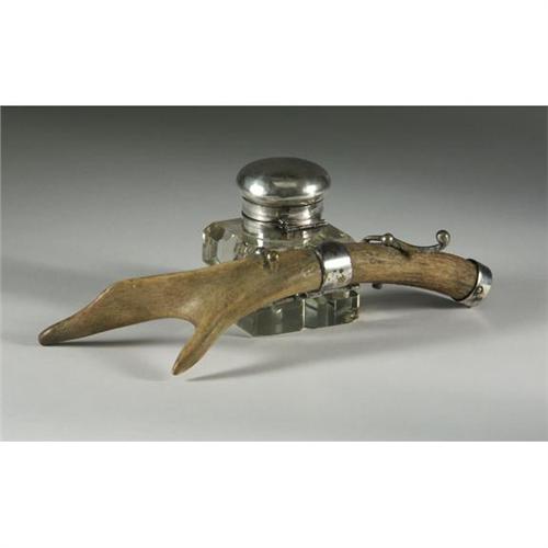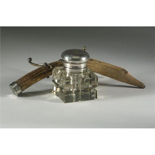 INKWELL: Heavy crystal inkwell with antler pen support, Victorian style silverplate over brass fittings with bun shaped lid, condition noted, 4'' x 11''.