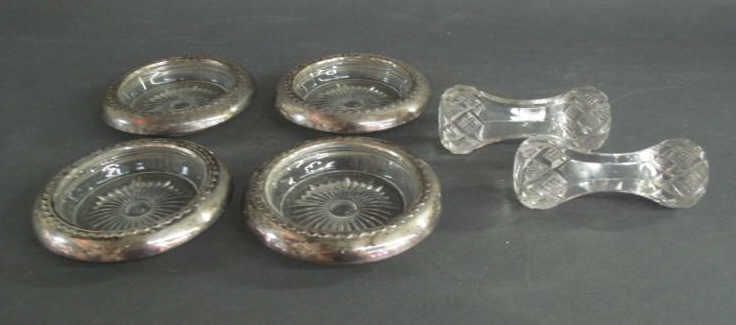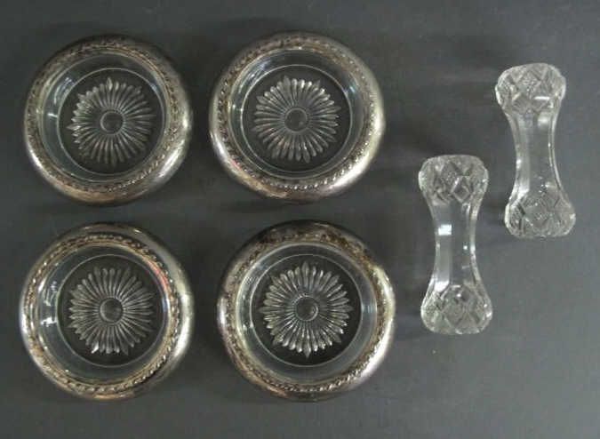 - includes two knife rests (width: 3 3/4") and 4 coasters with sterling silver rims (4" diameter)