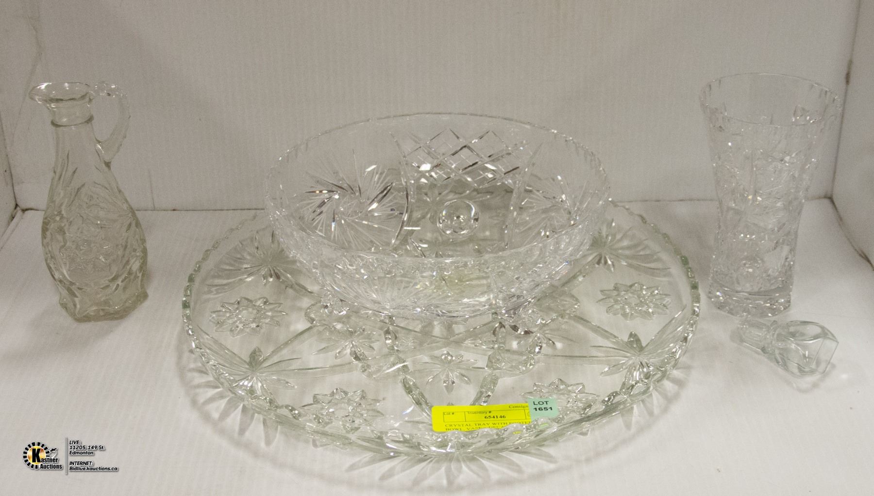 CRYSTAL TRAY WITH FOOTED BOWL, VASE + DECANTER