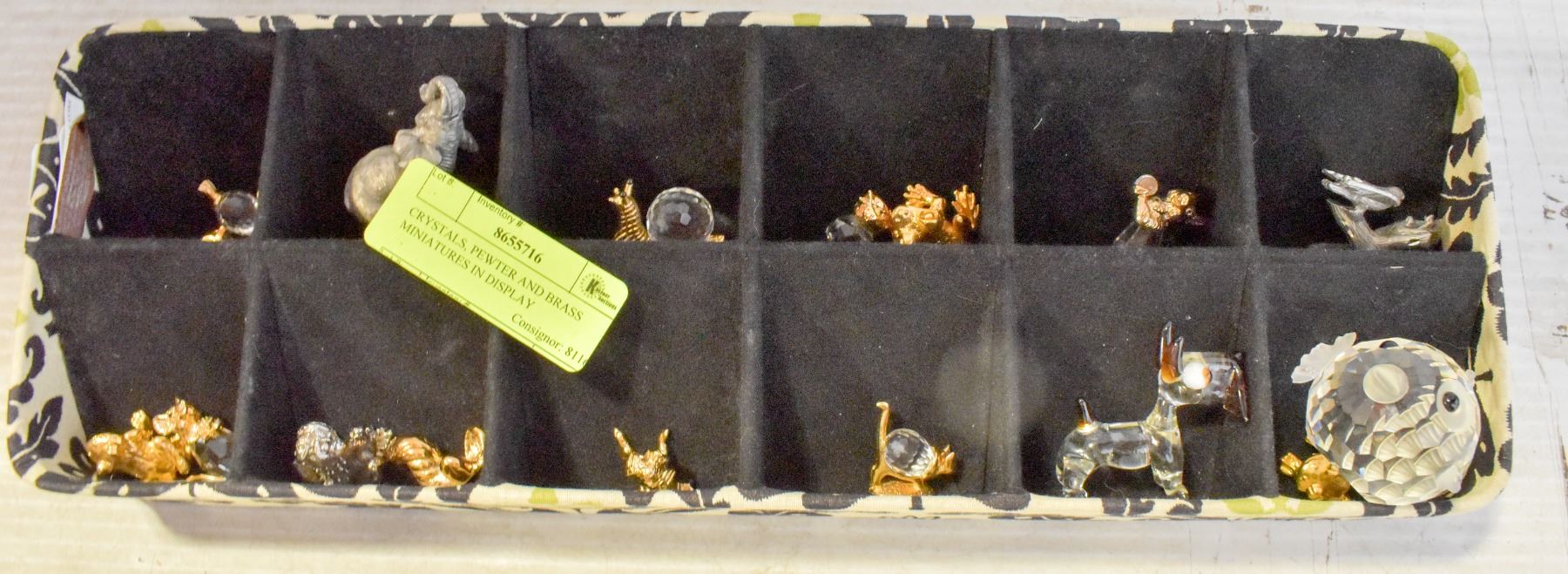 CRYSTALS, PEWTER AND BRASS MINIATURES IN DISPLAY