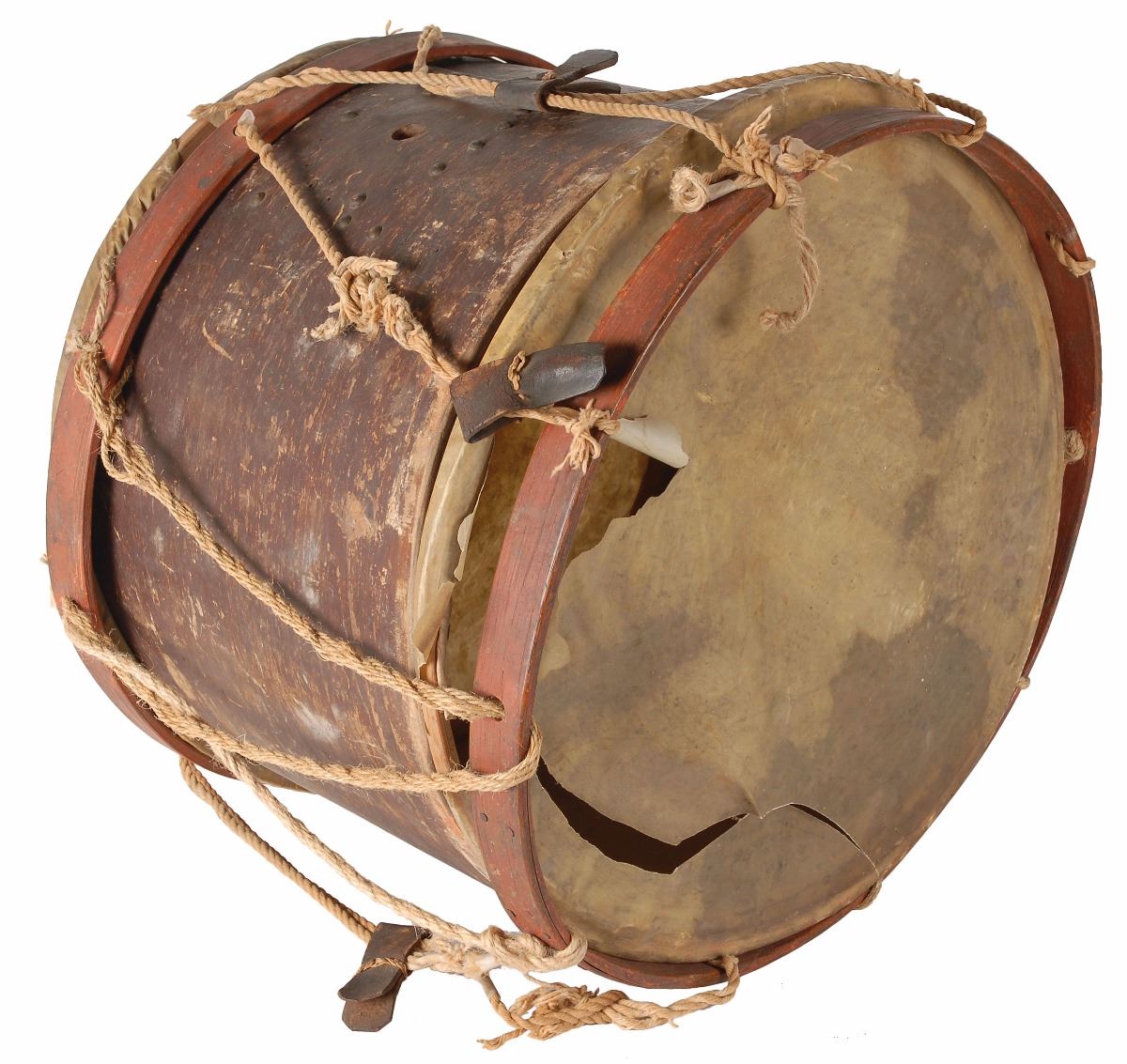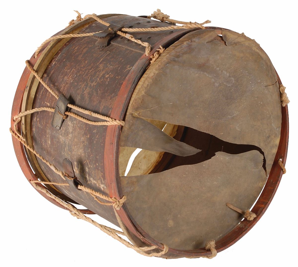 A typical rope tension drum measuring just over 17? in diameter and standing approximately 13 1/2? tall. The wooden body has an old dark brown painted finish that has heavily flaked and chipped over time while the hoops, held in place by fairly loose and frayed cords, have a faded period scarlet paint. Both of the drumheads have large tears and the snares are no longer attached. There are six leather tugs still installed, but only one has a scalloped edge and appears to be original, the rest seem to be period or field replacements and some of the brass stud decorations surrounding the peep-hole are missing. There is no maker's label on the interior but there does seem to be something illegible written in pencil. The drum was handed down by the descendants of Andrew Jackson Webb (1849–1924), of Fluvanna County in central Virginia. Mr. Webb, like most of his fellow Virginians, rushed to serve the nascent Confederacy and enlisted as a Private in the Fluvanna Artillery No. 1, known as the ’Sons of Fluvanna,’ on June 20, 1861. He mustered into the 1st Co. and served in that unit until October 4, 1862, when it was merged with its sister battery, Fluvanna Artillery No. 2, the ‘Fluvanna Light Artillery,’ to form the Fluvanna Consolidated Artillery. The Fluvanna Artillery was part of the Army of Northern Virginia and fought at the First Manassas, the Peninsula Campaign, Antietam, Gettysburg, the Wilderness, and Cold Harbor. During the battery's service, Webb rose slowly but surely in the ranks between 1862 and 1865, being promoted to 3rd Corporal, 2nd Corporal, Corporal, and Sergeant. In 1864, they were siphoned off from the Army of Northern Virginia and formed part of Gen. Jubal Early's Army of the Valley, serving in the Shenandoah Valley Campaign, and took part in numerous actions, including the battles of Monocacy and Cedar Creek. On March 2, 1865, they fought at the battle of Waynesboro, Virginia, and were all taken prisoner by the Union forces when Early's command was routed by a flank attack by George A. Custer’s cavalry division. Webb spent the remainder of the war as a prisoner interred at Fort Delaware, and eventually settled in West Virginia where he spent the remainder of his life.