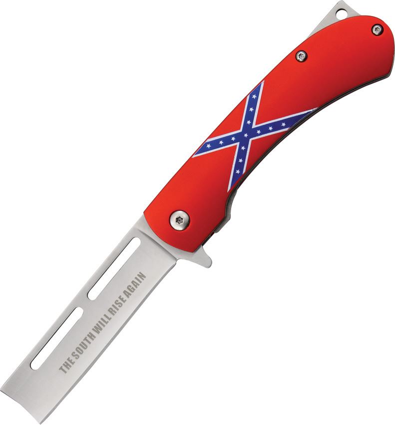 4 1/4" closed linerlock. 3" stainless razor blade with extended tang. Blade is etched The South Will Rise Again. Red anodized aluminum handles with extended tang with lanyard hole. Front handle with CSA flag design artwork. Stainless pocket clip.