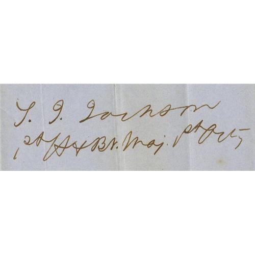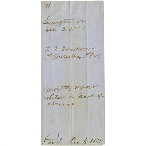 <B>Confederate General Thomas J. "Stonewall" Jackson Handwritten and Signed Document.</B></I> Wrapper page for his "monthly report whilst on leave of absence" signed as U.S. Army major. All the text is in his hand. Measures overall 7.5" x 9" when unfolded, written panel is 3" x 7.5". Beautiful condition for this rare and sought-after autograph.<BR><BR><b>Shipping:</b> Small Collectibles (<a target="_blank" href="http://www.heritageauctions.com/common/shipping.php">view shipping information</a>)