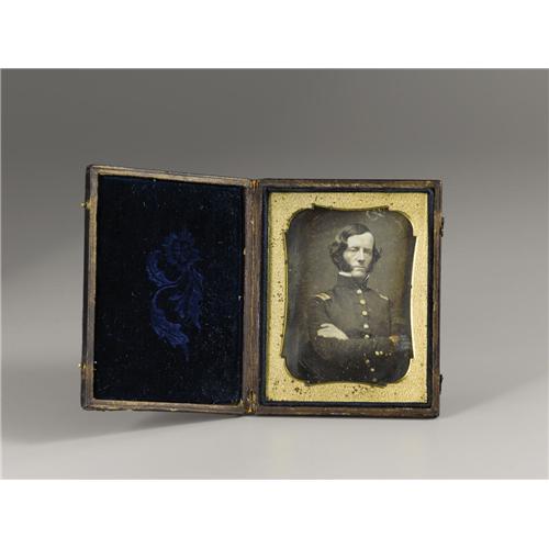 <B>Confederate Major General Carter Littlepage Stevenson Pre-war Daguerreotype.</B></I> Antebellum images of Confederate generals as junior officers are among the most prized collectibles in the fields of early photography and historical militaria. The stern young officer depicted in this splendid portrait is C.L. Stevenson of Fredericksburg, Virginia (1818-1888), probably as a captain in the early 1850s. A manuscript note accompanying the image reads, "<I>By J.L. Griffing 214 Main St Buffalo From O.B. Evans Gallery</B></I>." Griffing is known to have been working in Buffalo at this address in 1852-1853 before launching his own studio in 1855. The Evans establishment employed numerous photographers and lost no opportunity to enhance its reputation via international competition. Indeed, the company rightly played up a medal won at the great expo held in London's Crystal Palace in 1851. During this period, Stevenson probably had this picture taken while en route to one of his many postings along the western frontier. An 1838 West Point graduate and Mexican War veteran, the Virginian served in Texas and Utah until Virginia's secession. Stevenson followed his native state into the Confederacy and was briefly colonel of the 53rd Virginia Infantry. General Beauregard's intervention, however, directed Stevenson to the west where he proved himself an able division commander in that bloody theater. Stevenson was at Champion's Hill, Vicksburg, Lookout Mountain, Atlanta and Nashville. His war ended with the Army of Tennessee upon Joseph Johnston's surrender in North Carolina on April 26, 1865. The Stevenson daguerreotype harkens back to happier times when a Virginian could proudly wear a federal officer's frock coat. The image is moderately haloed and has a series of very light abrasions that do not detract and which are only visible when angled to a bright light. Only one other daguerreotype of Stevenson exists and it shows him as a VMI cadet. The case is in remarkably good shape with only a few minor scuffs and wear as expected. A small museum catalog number is painted in white along the top edge of the case. This is a rare opportunity to acquire an identified Confederate general's daguerreotype as a junior officer. Ex. William Turner, author of "Even More Confederate Faces".<BR><BR><b>Shipping:</b> Small Collectibles (<a target="_blank" href="http://www.heritageauctions.com/common/shipping.php">view shipping information</a>)